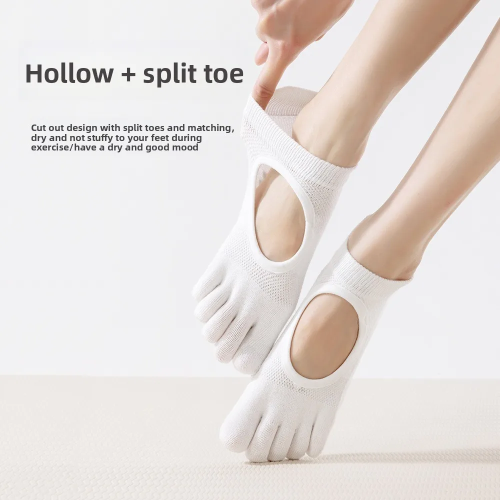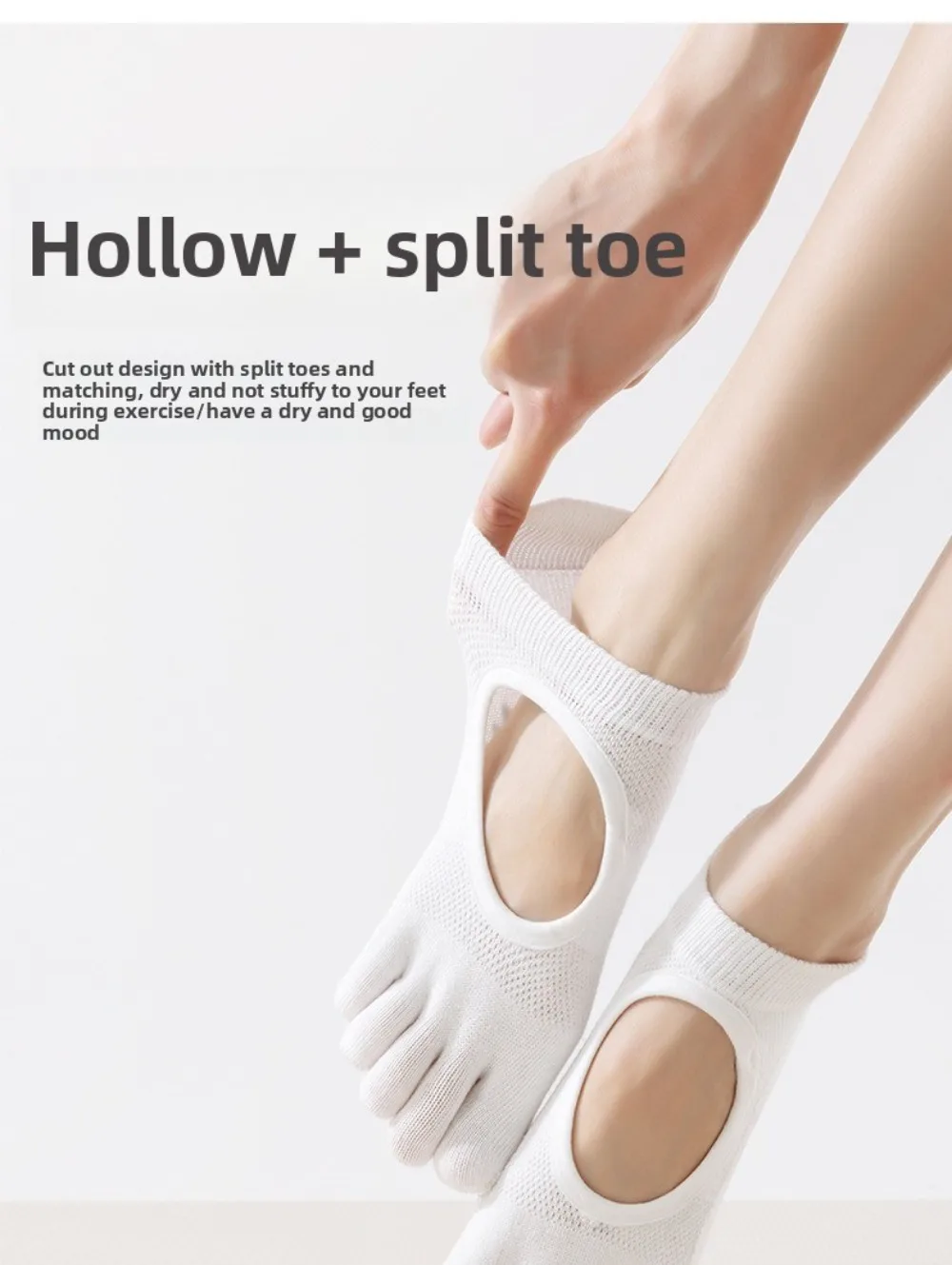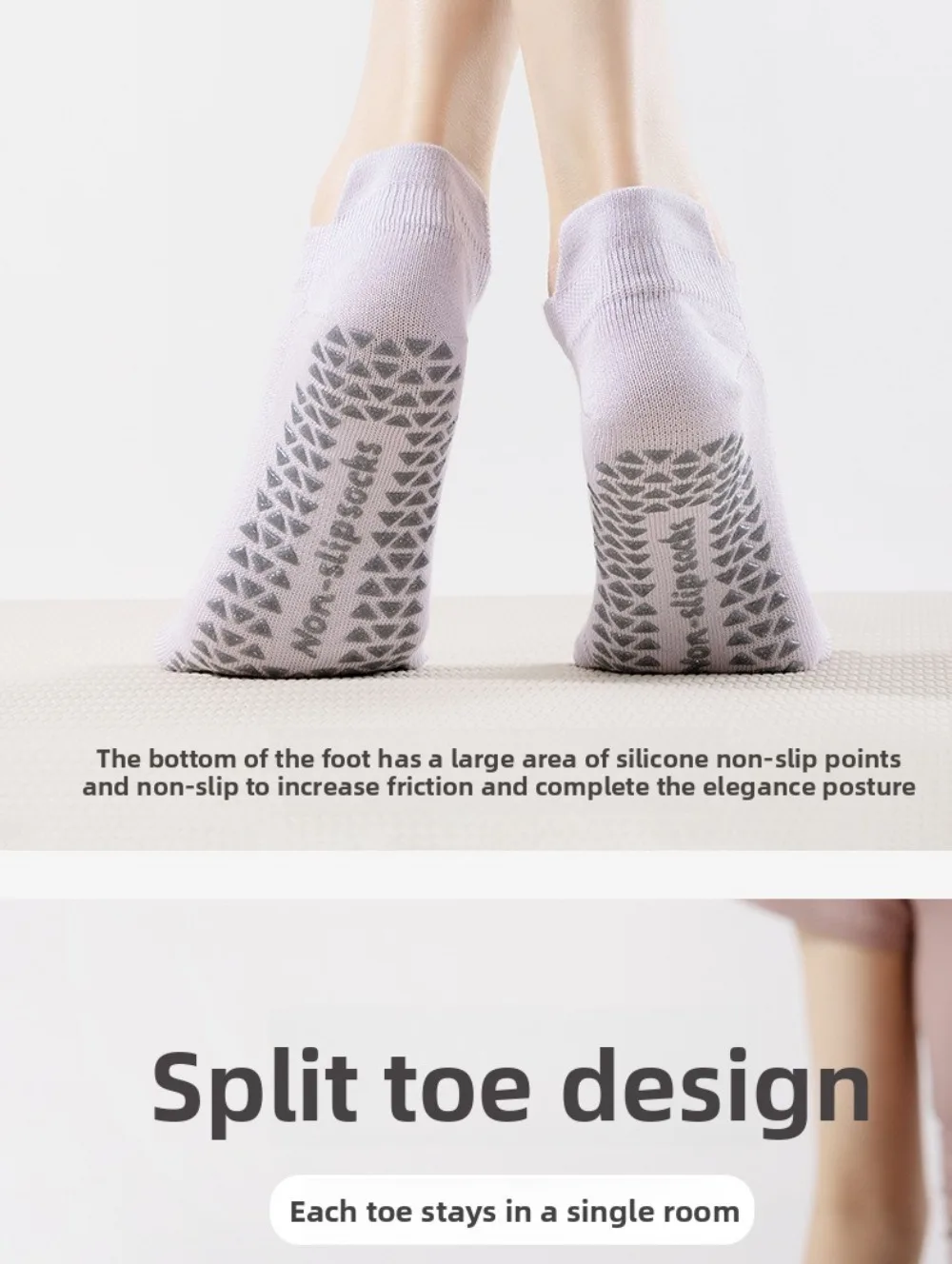 2.**Flexibilidad de cinco dedos**: Diseñados con ranuras para los dedos individuales, estos calcetines promueven el movimiento y la flexibilidad naturales, ideales para sesiones de danza y yoga.
