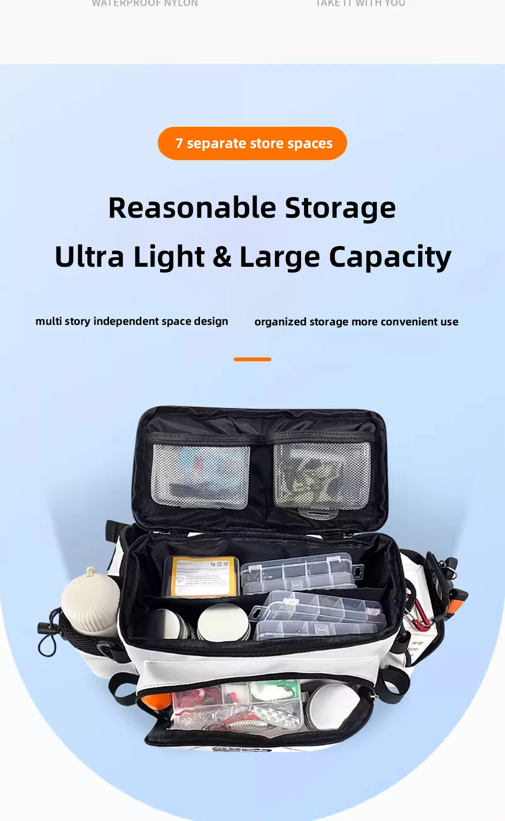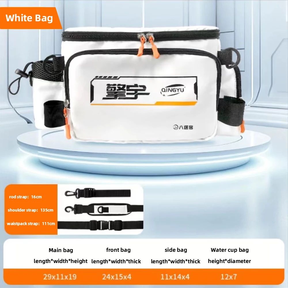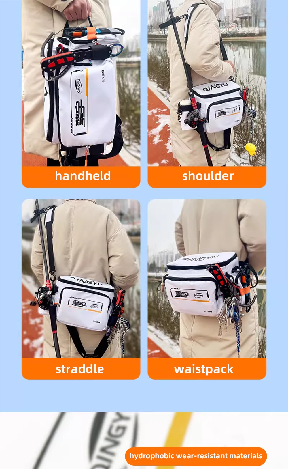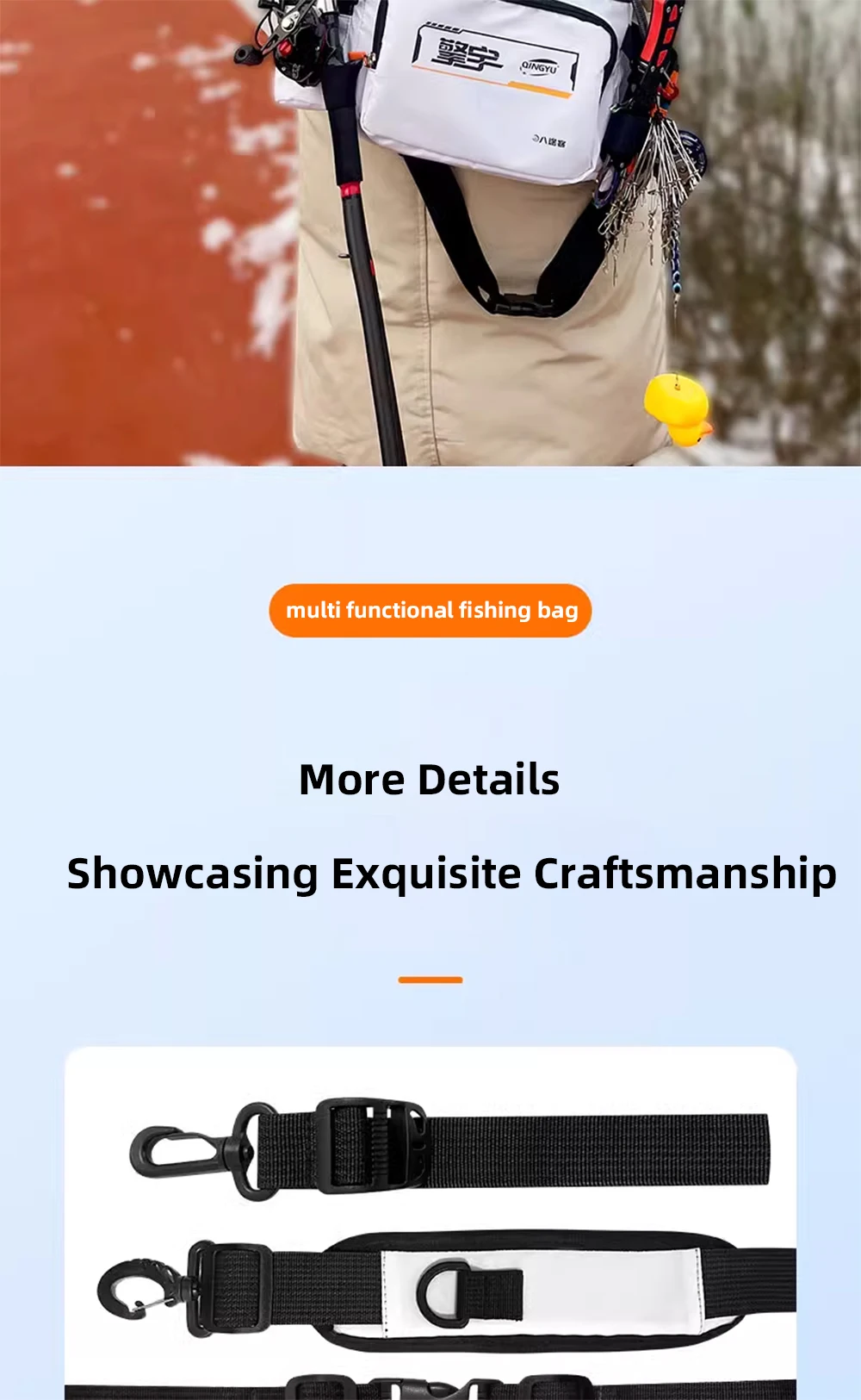 04: El diseño general Blanco/azul de la bolsa de pescado es más de gama alta y atmosférico, que se puede utilizar no solo como bolsa de pesca sino también como bolsa de viaje.