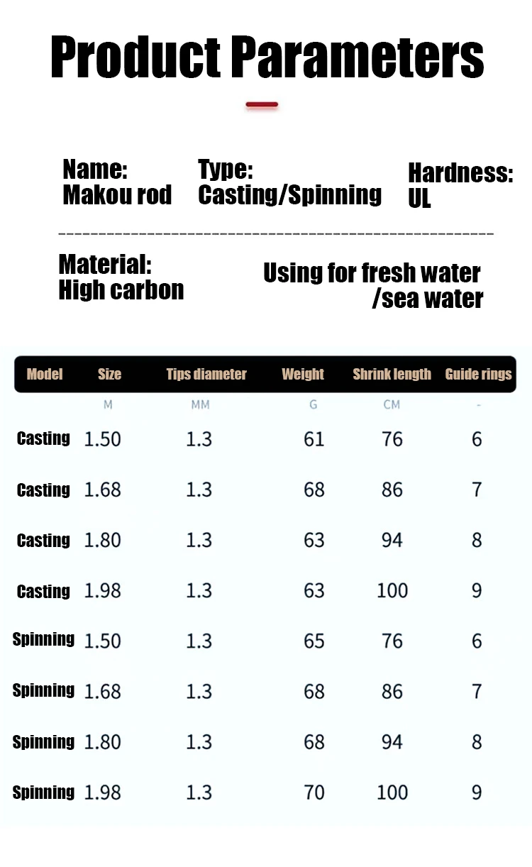 7: Esta caña tiene caña giratoria y de fundición, tiene 1,5 M/1,68 M/1,8 M/1,98 M Puede cumplir con los requisitos de la mayoría de las personas para las cañas de pescar