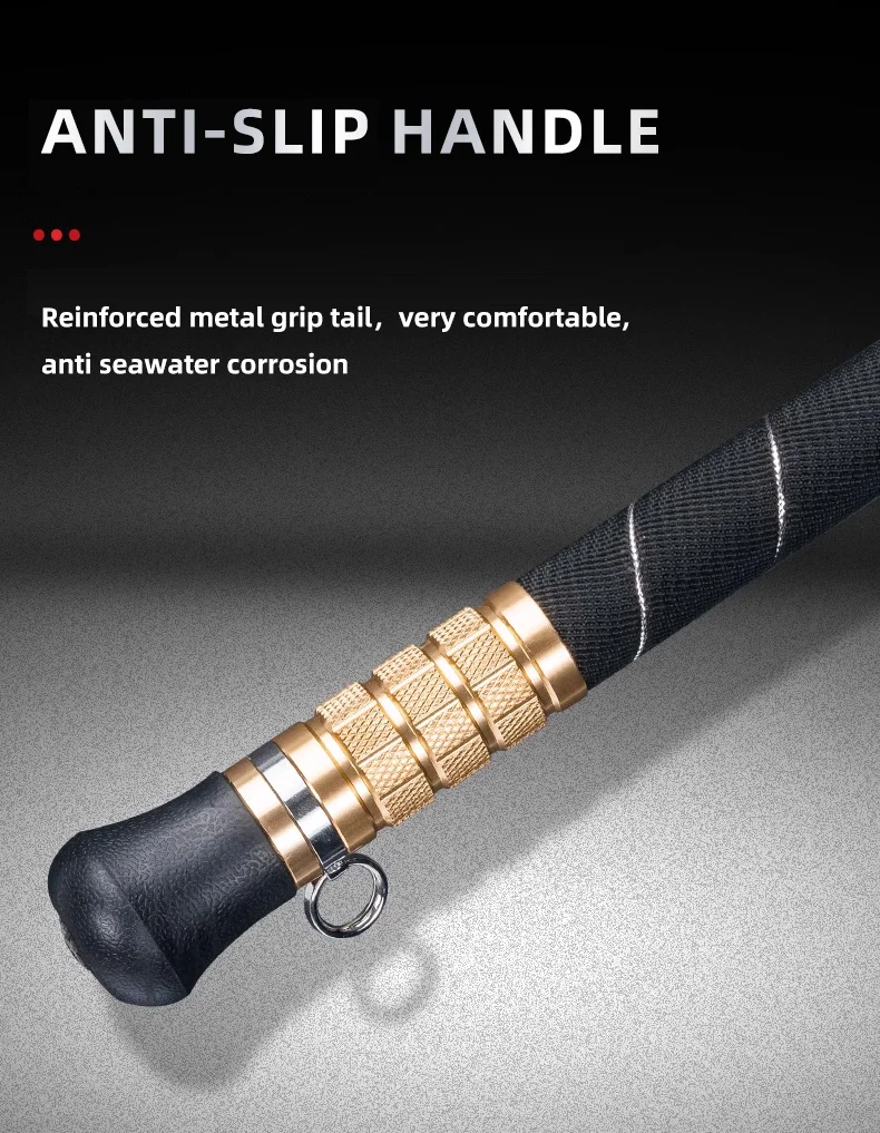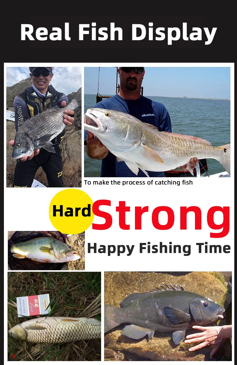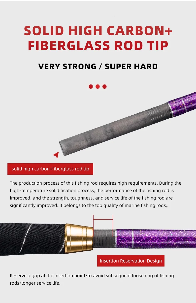 1: Toda la caña de pescar está hecha de material de alto carbono importado y está hecha por un proceso en forma de X, la dureza de La caña tiene 100 #-120 #/150 #/200 # muy dura que el peso del plomo puede alcanzar los 2300G, lo que garantiza que toda la caña de pescar sea más ligera y más dura, se encarga fácilmente de los choques de peces grandes.