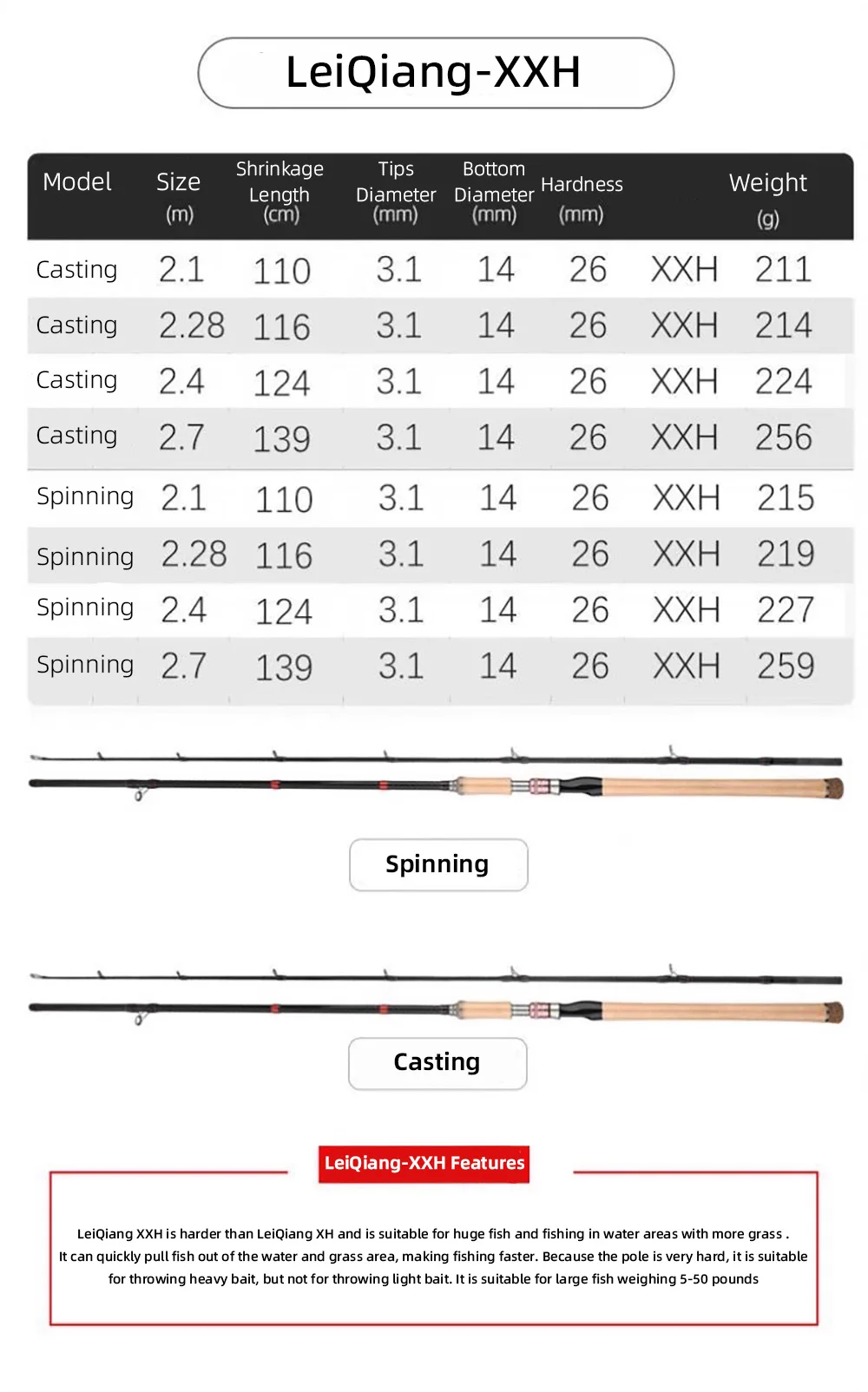 Dureza: XH: Peso del señuelo 10g-90g XXH: Peso del señuelo 10g-120g