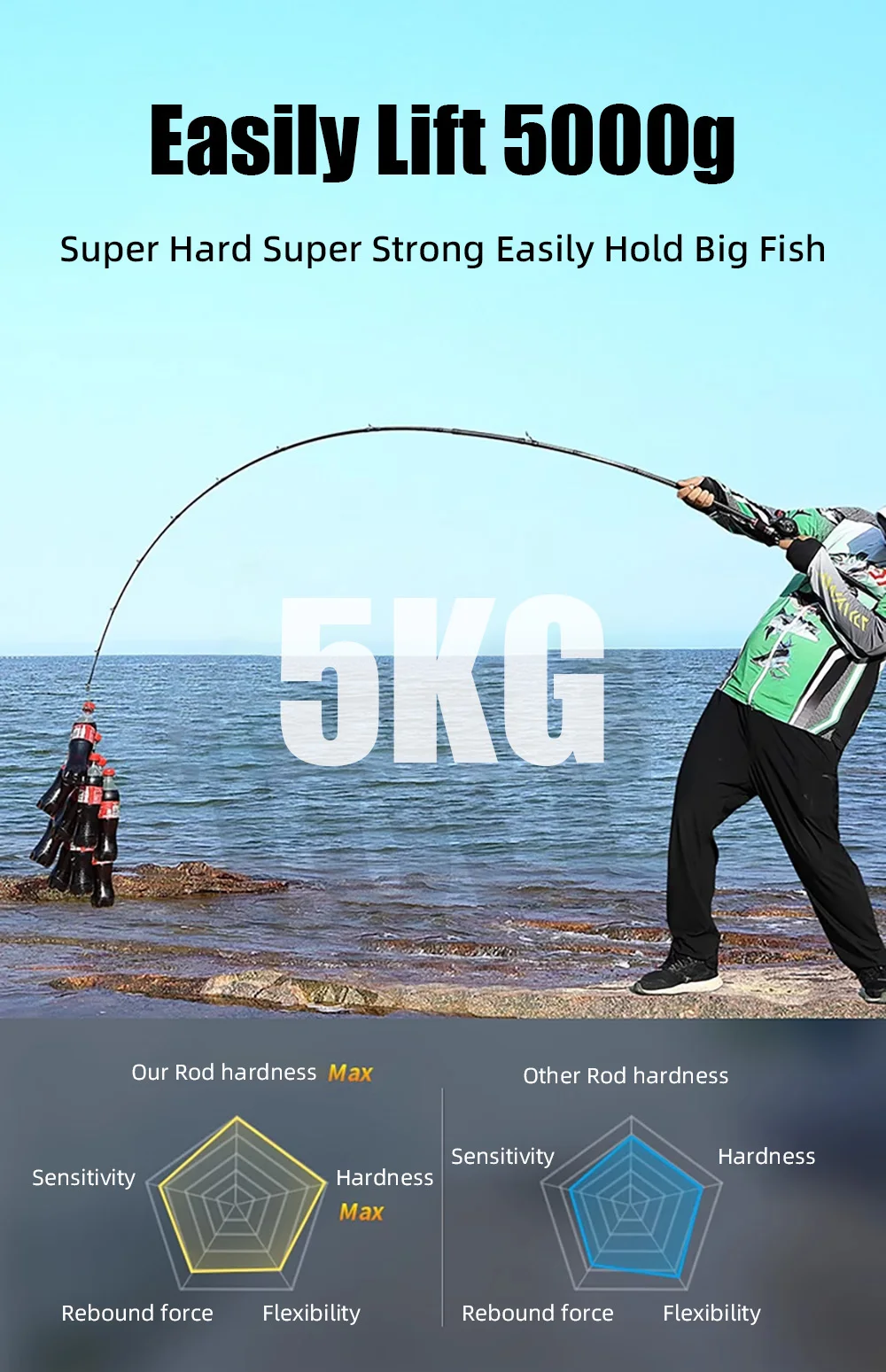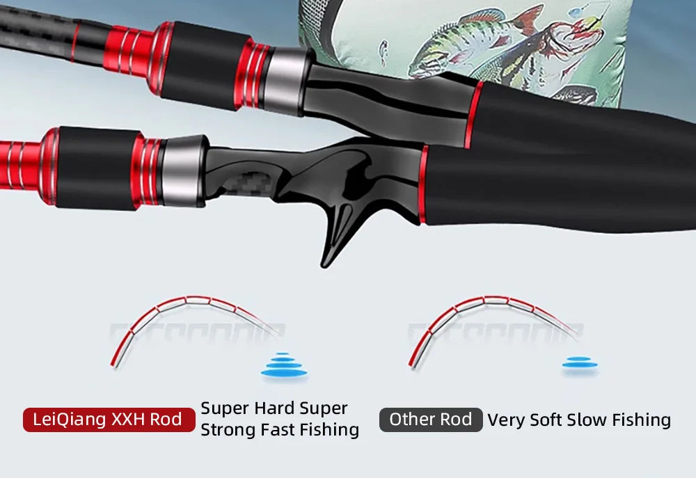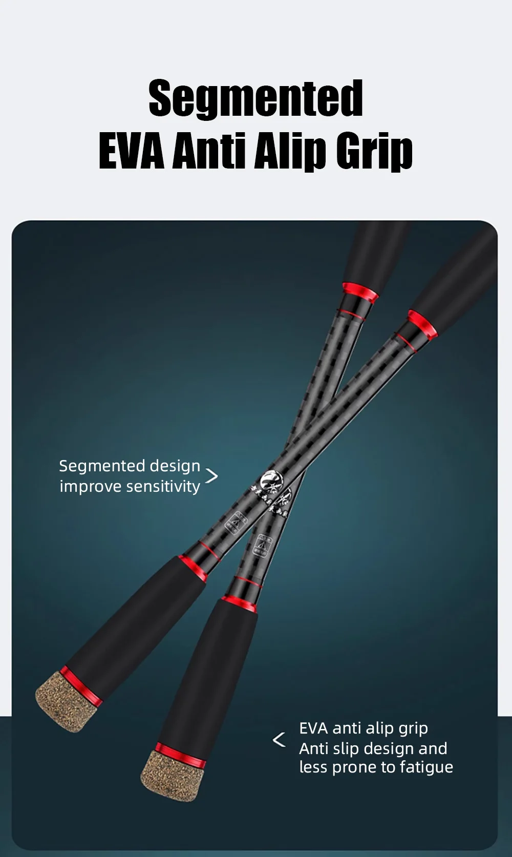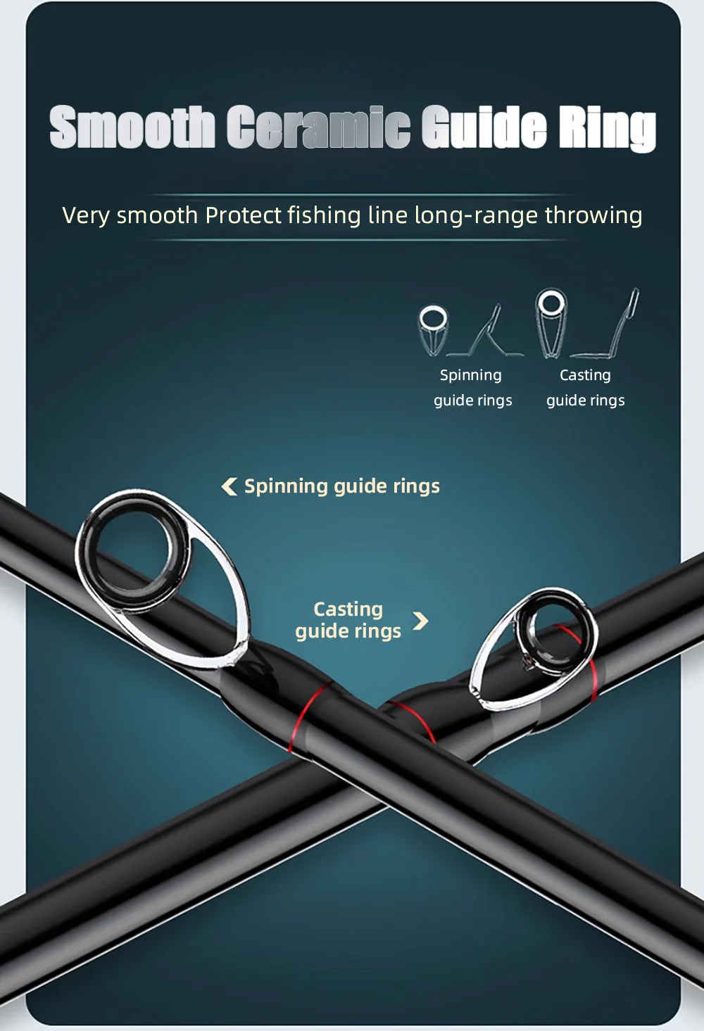 1: Toda la caña de pescar está hecha de material de alto carbono importado y está hecha por un proceso en forma de X, la dureza de la caña alcanza XH/XXH y el peso del señuelo puede alcanzar demasiado 120g, lo que garantiza que toda la caña de pescar sea más ligera, más dura, lidiando fácilmente con los golpes de peces grandes.