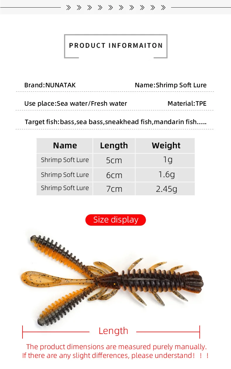 ShrimpLure Length:5CM/6CM/7CM Weight:1g/1.6g/2.45g 10P-1Bag Target Fish:bass/mandarin fish/trout/snakehead ..... and aggressive fish.