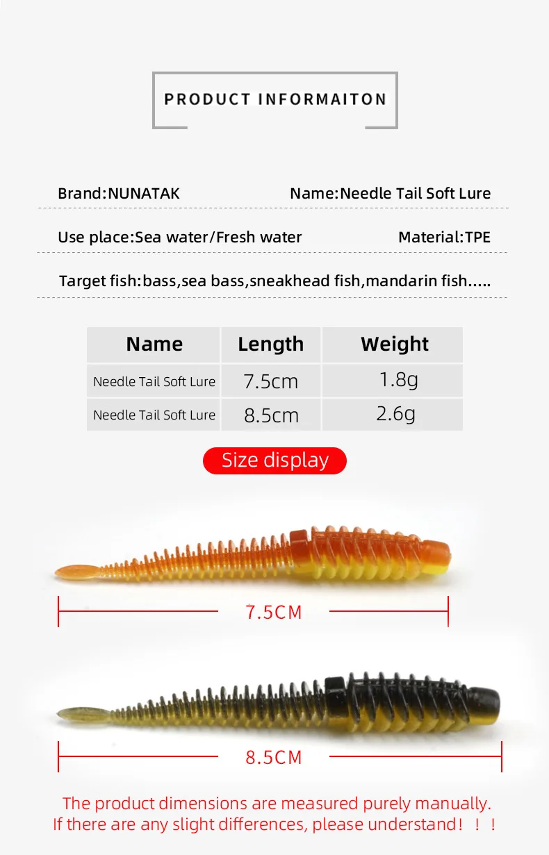 NeedleTail Length:6.5CM/7.5CM/8.5CM Weight:1.1g/1.8g/2.6g 10P-1Bag Target Fish:bass/mandarin fish/trout/snakehead .... and aggressive fish.