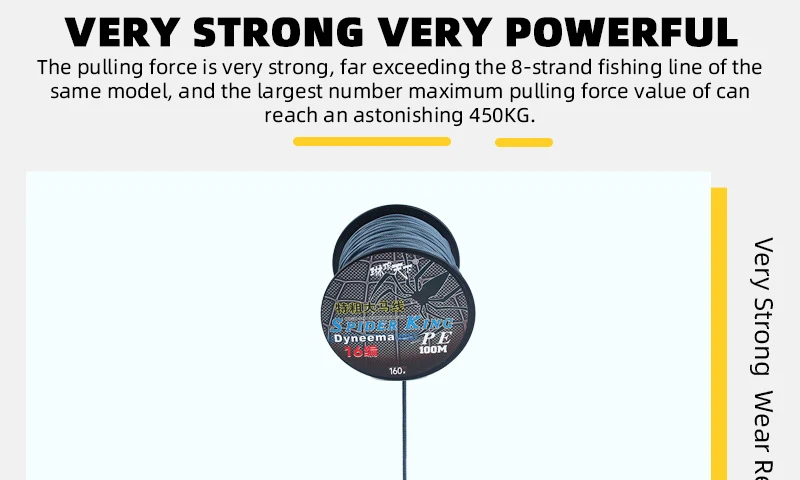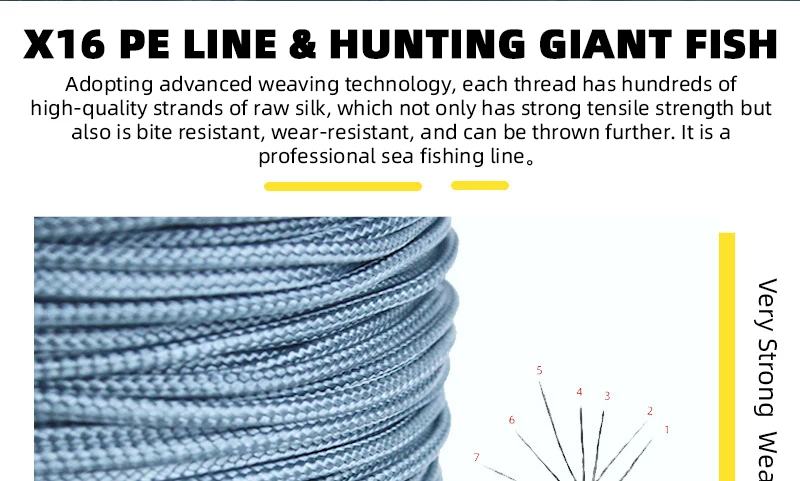 Este hilo de pescar es X16 más suave y suave que otros hilos de pescar tejidos, lo que puede aumentar efectivamente la distancia de lanzamiento. Lo más importante es que este hilo de pescar es muy fuerte, por lo que no perderás a tus peces grandes.!!!!!!!!!!!!!