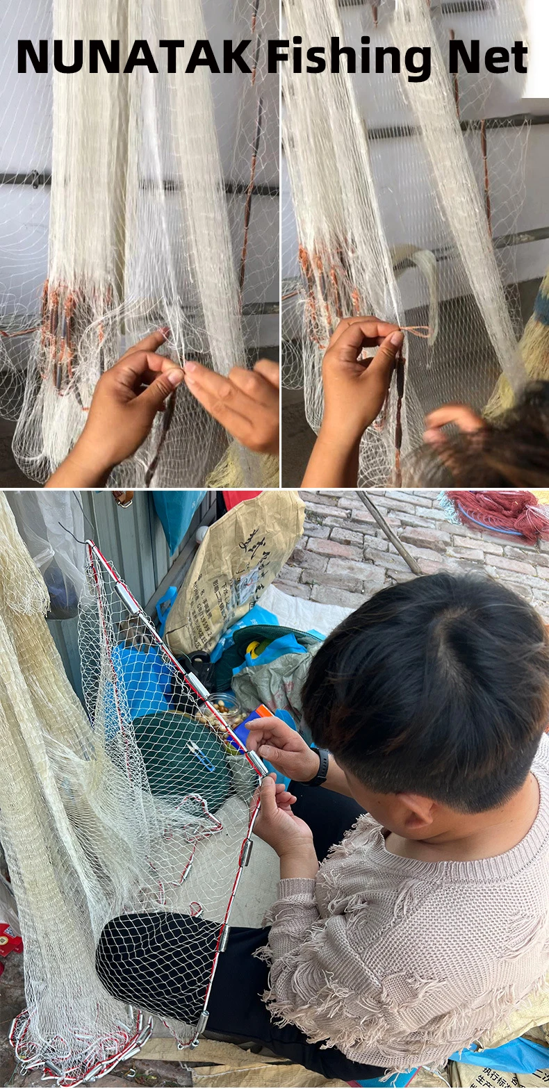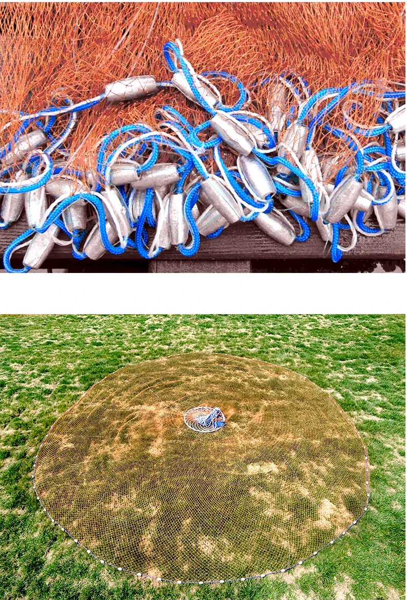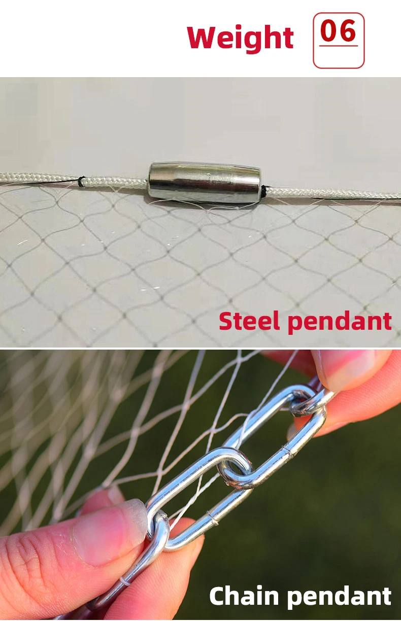 03: La parte inferior de la red de pesca está equipada con un diseño de plomo de acero, que no solo favorece el desplegado de la red de pesca sino que también tiene una velocidad de hundimiento muy rápida para lograr una pesca rápida.