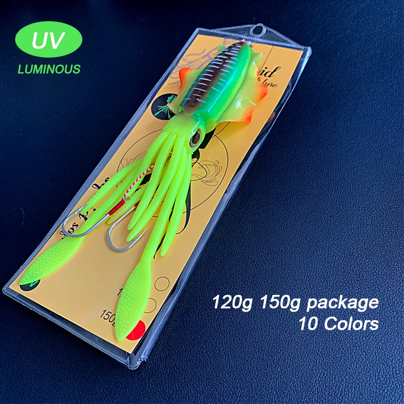OBSESSION Squid Jig UV Luminoso - Señuelo de calamar artificial de silicona suave con efecto UV/luminoso. Goma Artificial para pesca en el mar, trolling y jigging. Disponible en 60g, 120g y 150g. Ojos 3D y alas con acción realista.