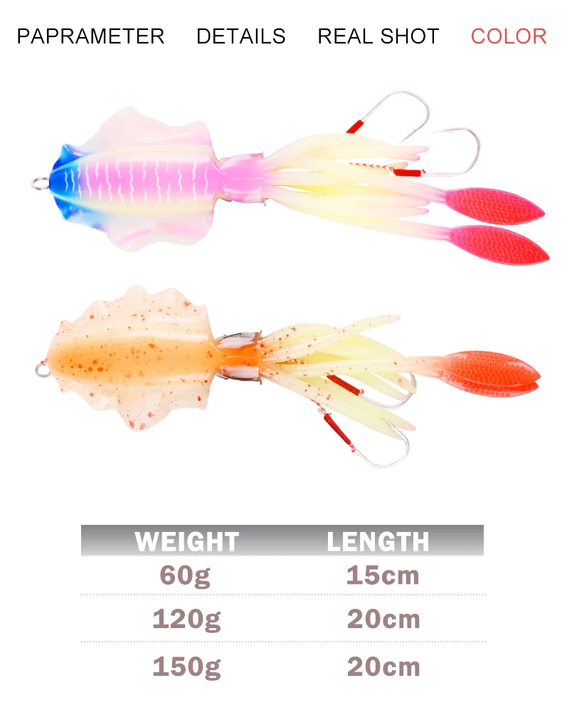 Nuevo diseño que incluye un plomo dentro del señuelo de calamar y anzuelos de asistencia gemelos 4/0 offset. Lista para usar directamente o personalizar.