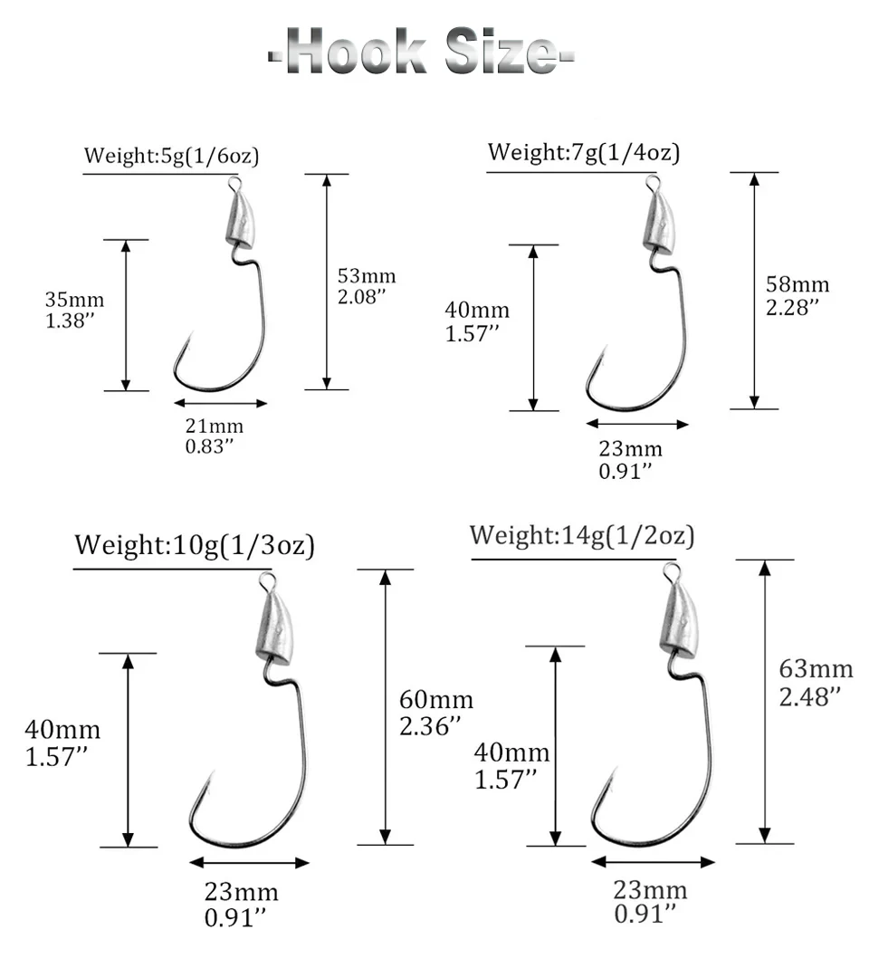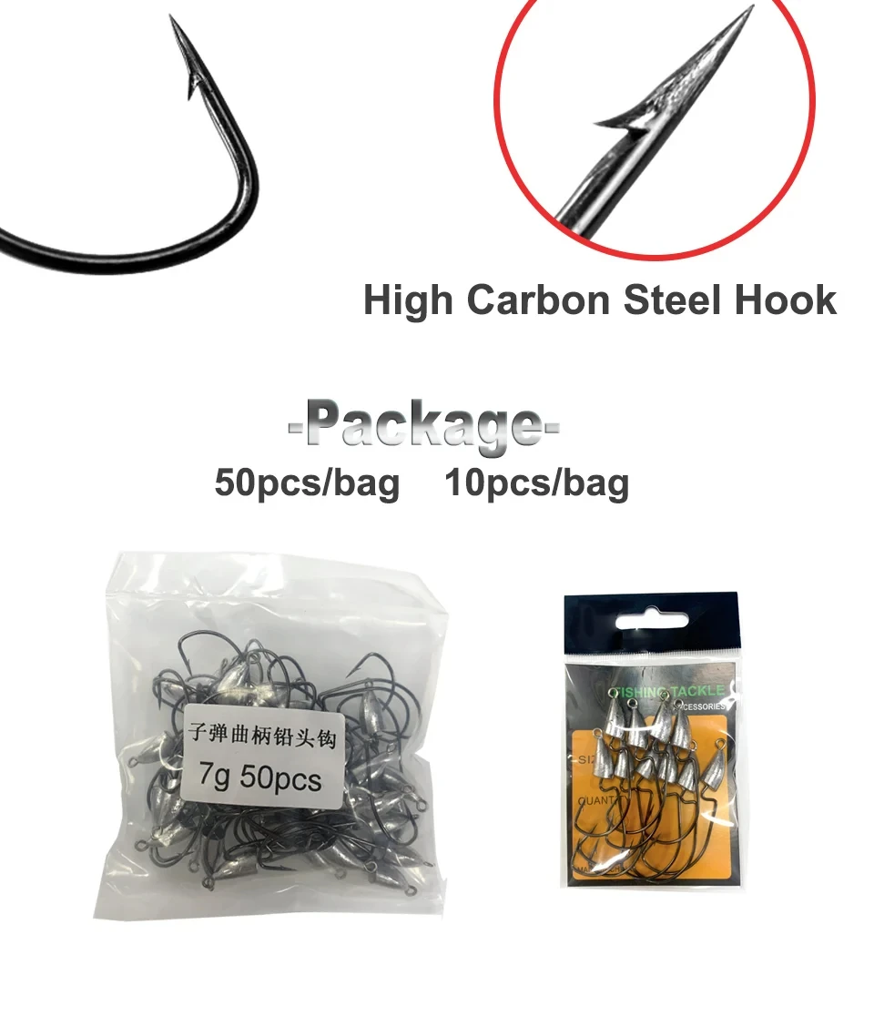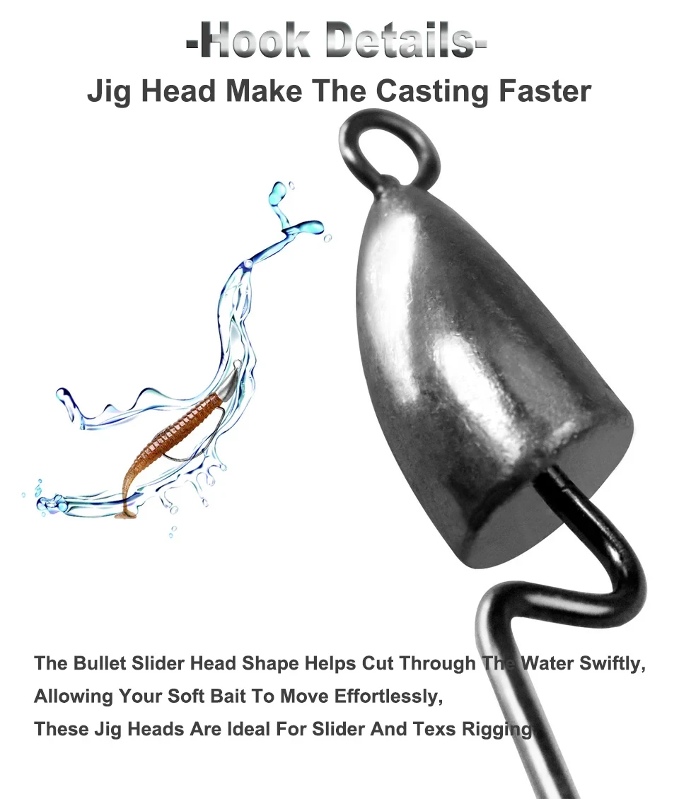 2. El gancho de alambre ligero presenta un hombro doblado de 90 grados, Punta súper aguja. Al voltear gusanos y pequeñas criaturas cebos en áreas estrechas la plantilla de bala proporciona un peso fijo perfecto para entrar y salir con facilidad.