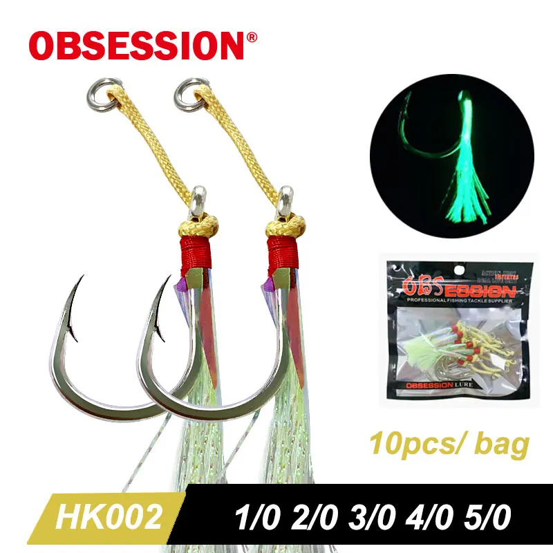 OBSESSION Kevlar Line 1/0 2/0 3/0 4/0 Single Assist Jigging Hook High Carbon Steel Thread Feather Jig Head Luminous Hooks Pesca