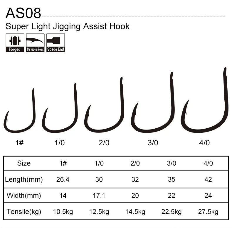 * AS08 es un pequeño anzuelo de jigging que admite altas dimensiones para microjigging dirigido a varios objetivos.