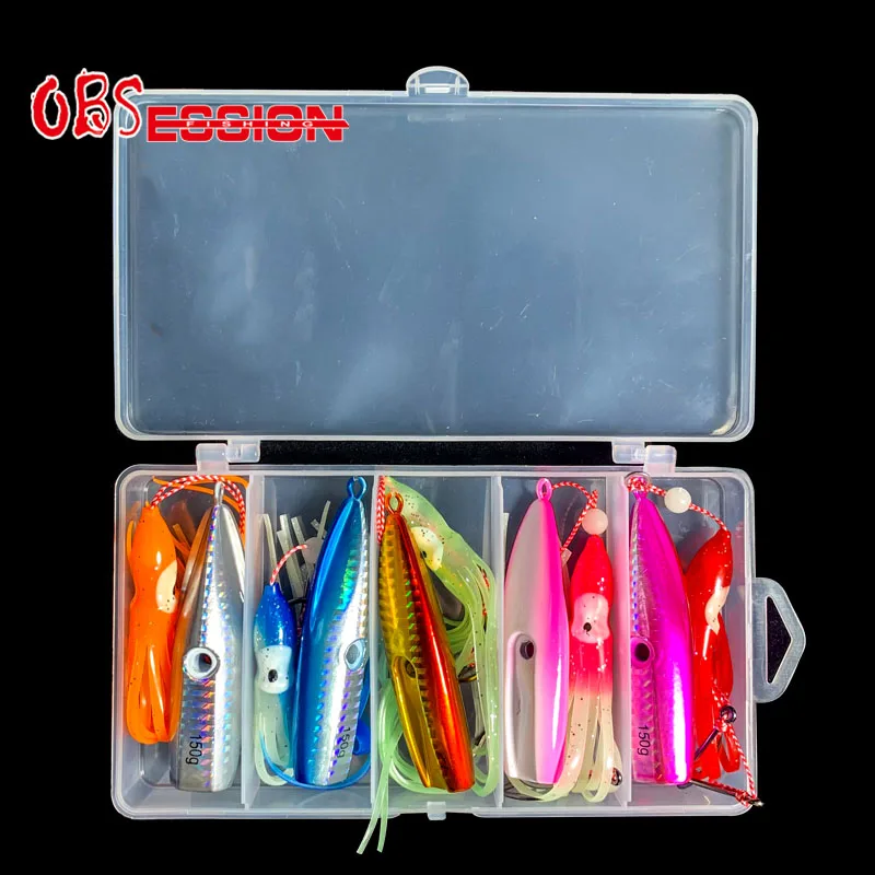 OBSESSION-Conjunto de caja de señuelos de Metal duro, señuelo Jig de Inchiku, 80g, 100g, 120g, 150g, Tai Rubbers, plantilla deslizante Kabura con ganchos de asistencia, 5 uds.