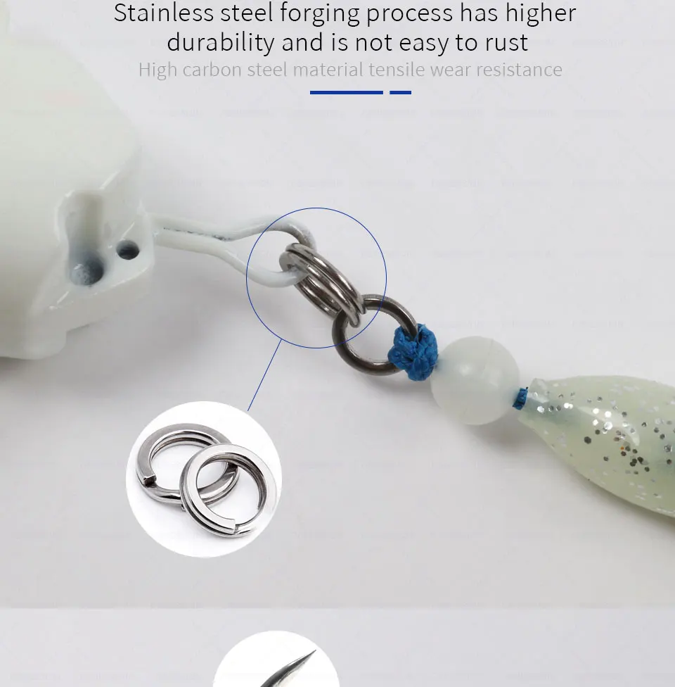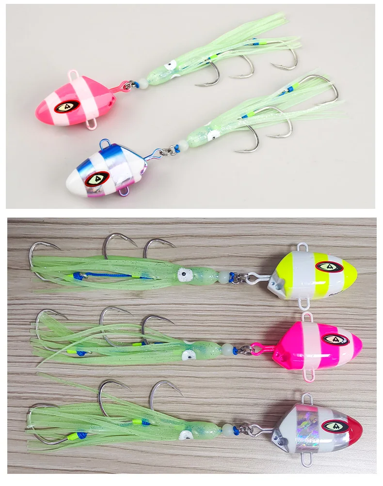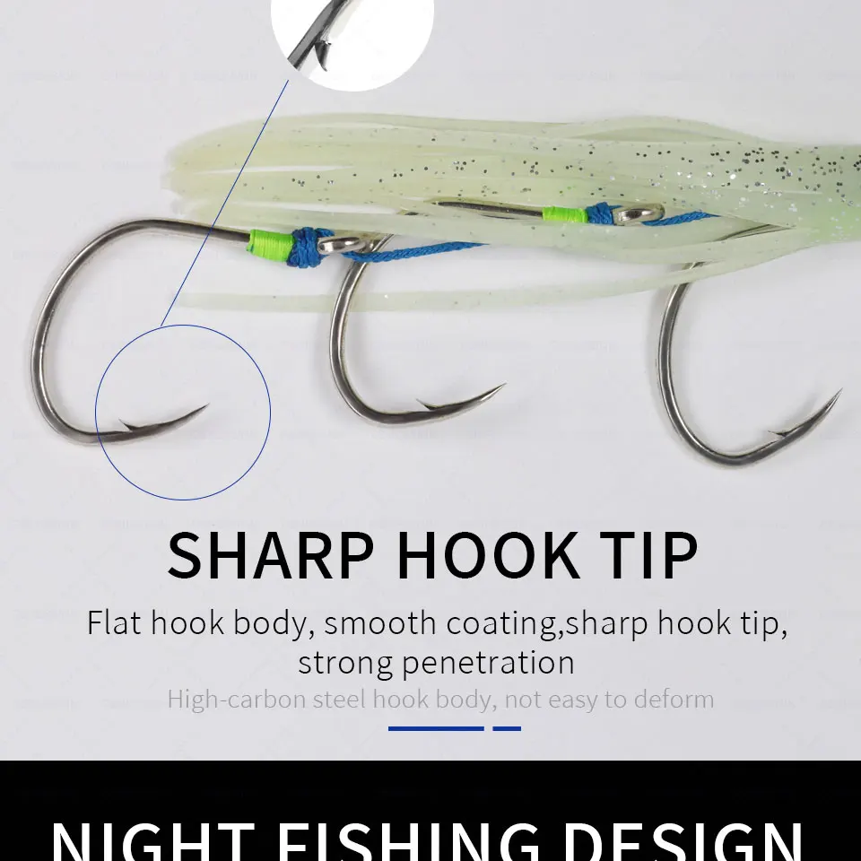 3.Durable silicon skirts and trailers wobble and vibrate during the jig movement while the glow eye provides extra appeal in the deep water.