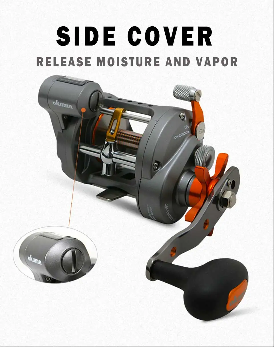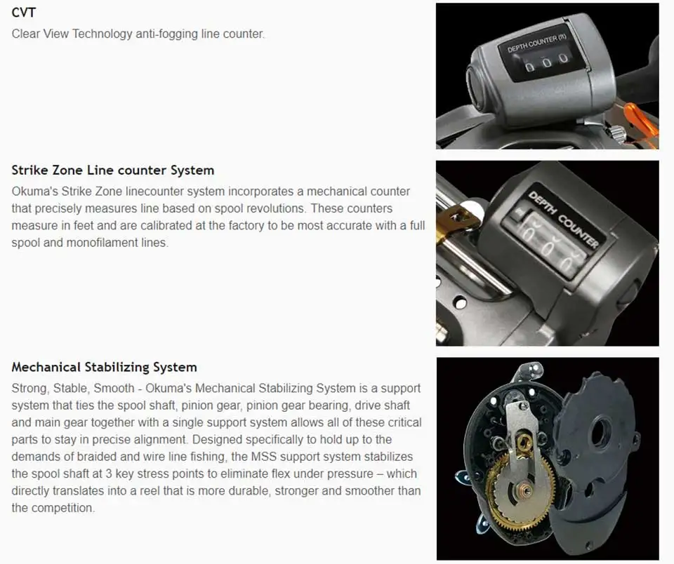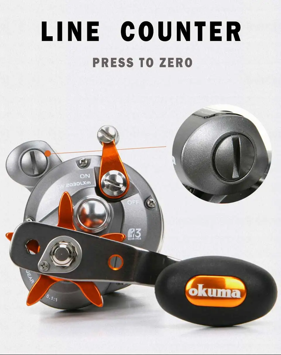 Los contadores de línea de agua fría Okuma están construidos sobre una poderosa base de arrastre de estrella que incluye engranajes de latón cortados a máquina para trabajo pesado, sistemas antiretroceso duales y sistema de arrastre de carbonita completo con hasta 7kg de salida de arrastre máximo, tecnología de visión clara antivaho Okuma. Los carretes están disponibles tanto en la mano derecha como en la izquierda y también proporcionan una Edición Femenina púrpura-Rosa.