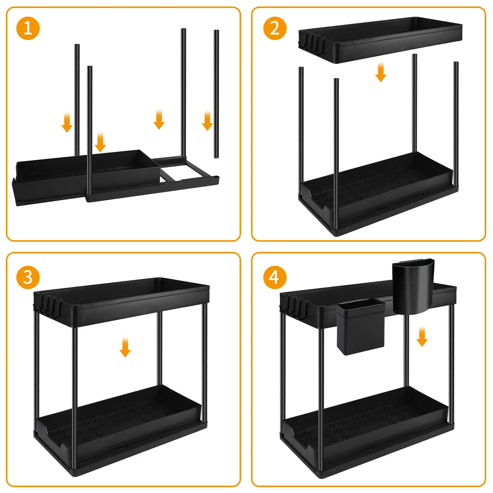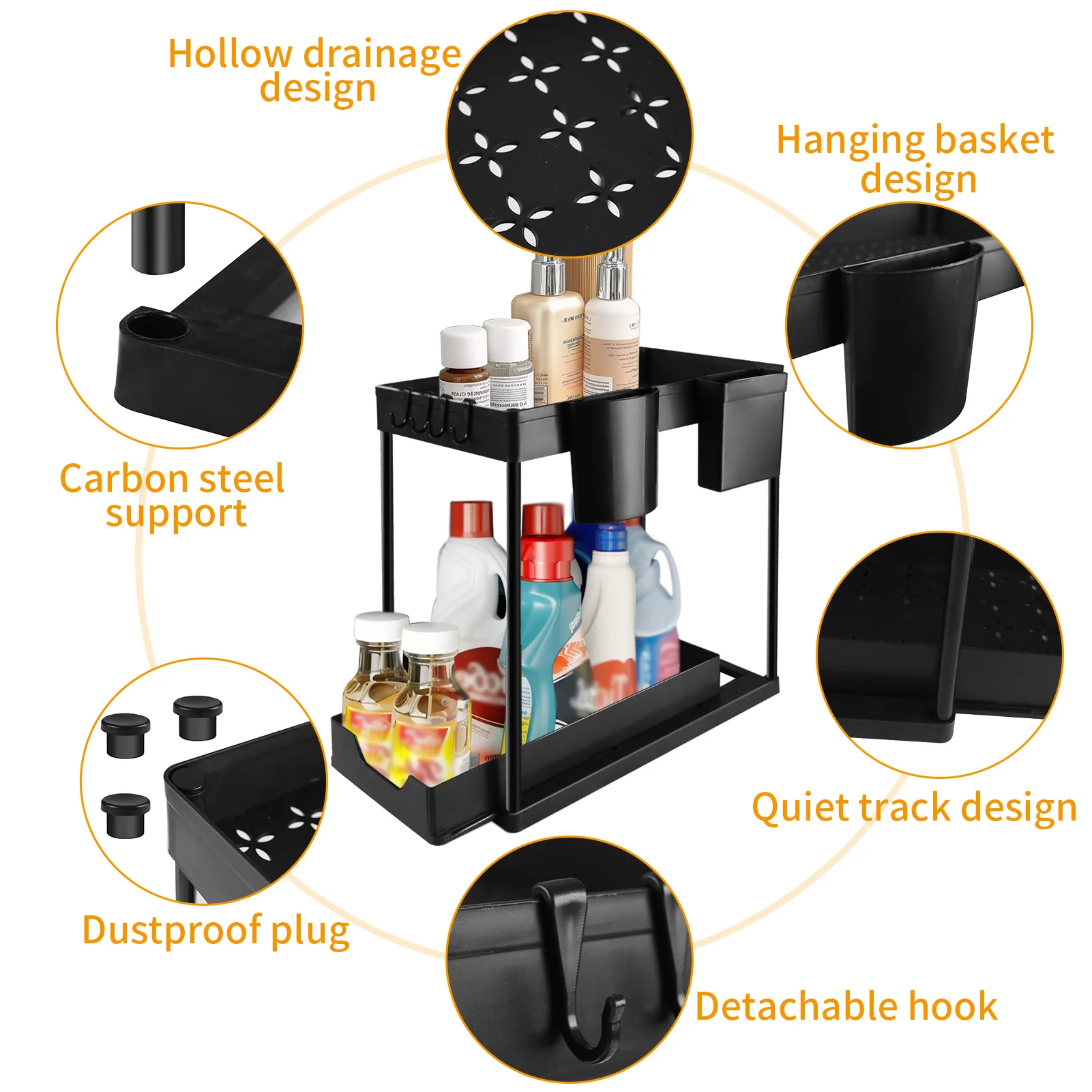 【Ahorre espacio y organice cuidadosamente】 El almacenamiento debajo del fregadero maximiza el ahorro de espacio, el diseño de doble capa le ayuda a almacenar más artículos en el mismo espacio.El organizador de almacenamiento puede contener líquido para lavar platos, champú, gel de ducha, cosméticos, etc.Hacer botellas y frascos más ordenados debajo del fregadero.