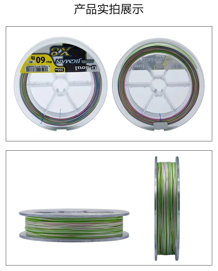 2: Los parámetros marcados en el producto representan el valor máximo de fuerza de tracción del hilo de pescar, que lo proporciona el fabricante.Por ejemplo,# 1.5=30LB representa MAX 30LB, que generalmente no puede alcanzar el valor máximo