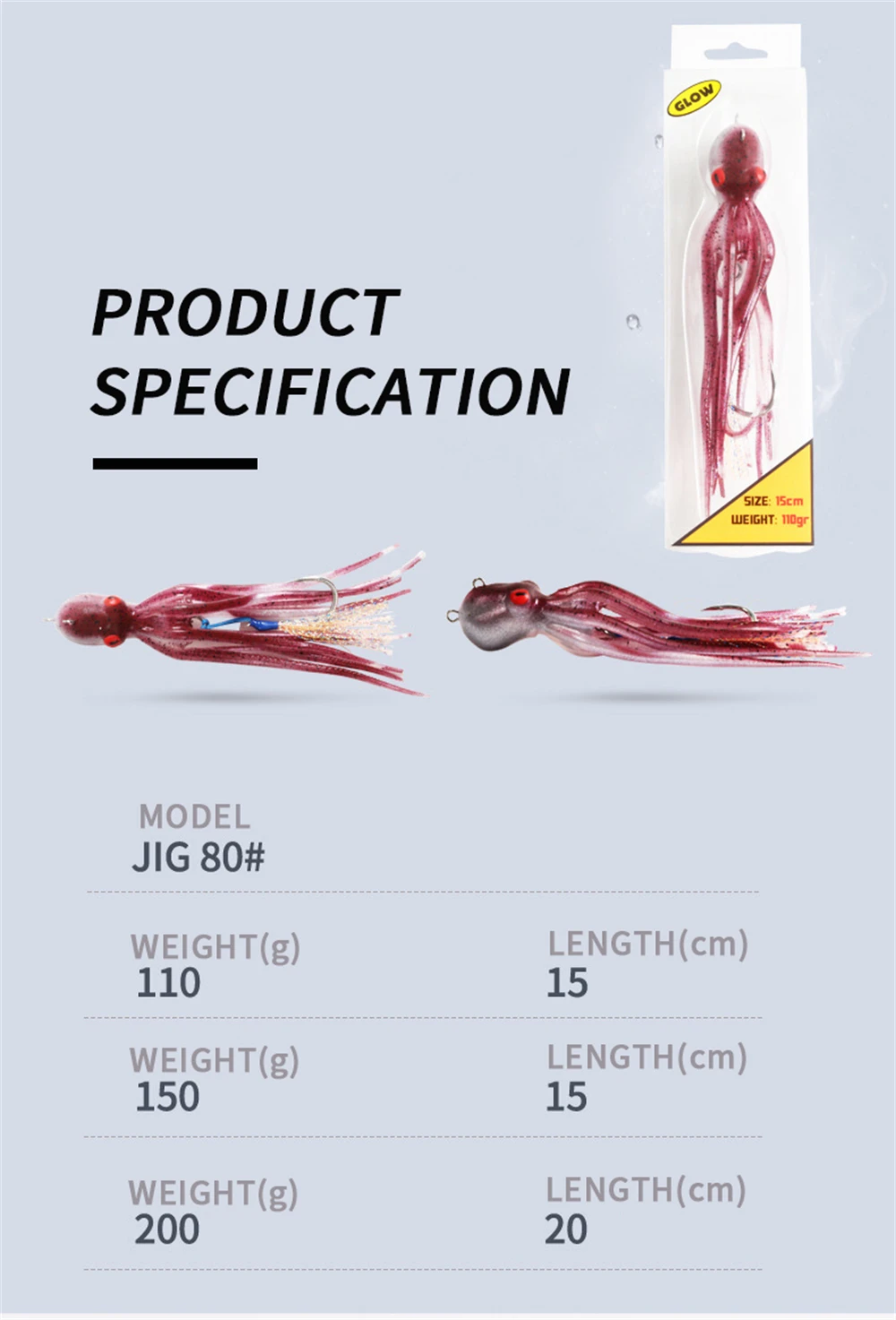 Jigs de Lingcod: Los Señuelos de Pesca de pulpo suave se pueden aplicar para atrapar lingcod, lubina, pez mandarín, etc. Un peso de plomo dentro de la cabeza del pulpo garantiza una gran distancia de lanzamiento, especialmente en agua salada, como la pesca en el océano y la pesca en roca.