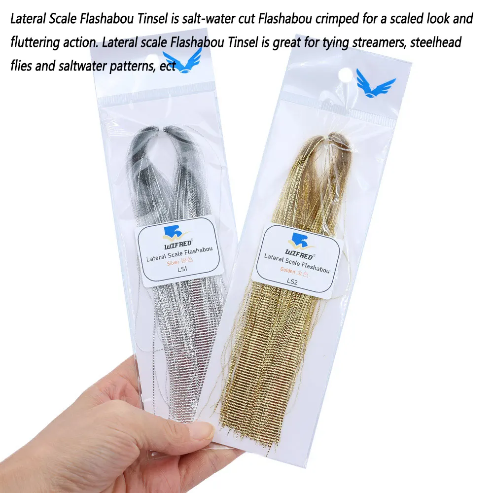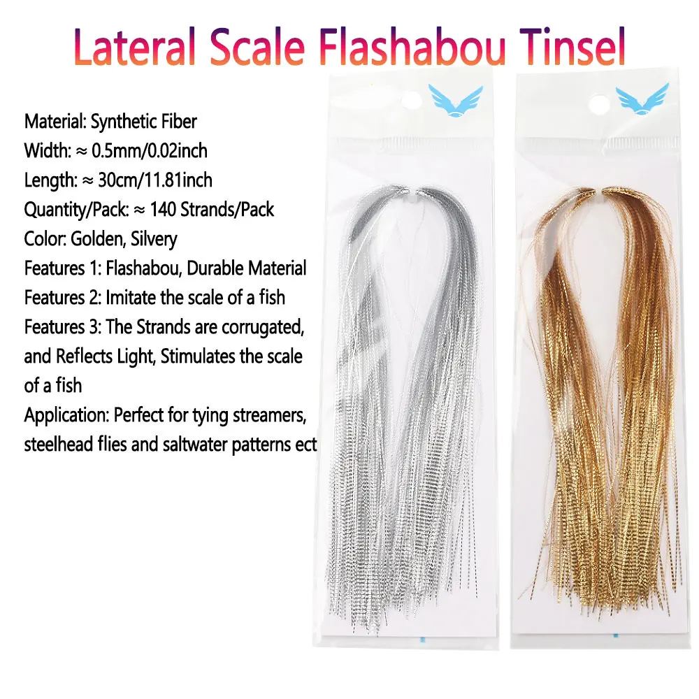 Flashabou Tinsel a escala lateral tiene un Flashabou cortado con agua salada y engarzado para una apariencia escamada y una acción voladora.Flashabou Tinsel a escala lateral es ideal para atar serpentinas, moscas de cabeza de acero y patrones de agua salada, etc.