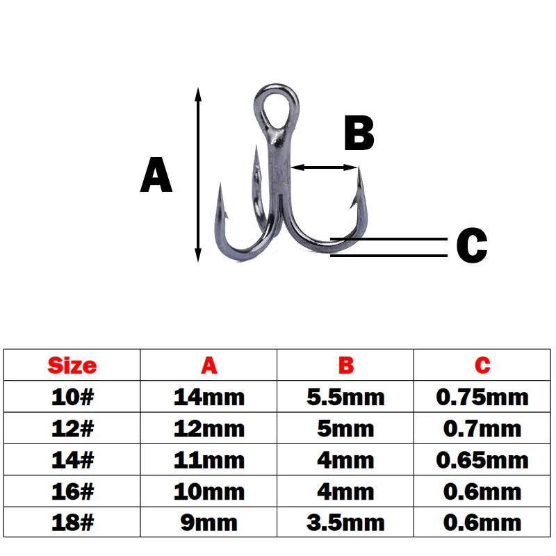 Descripción :OUTKIT 10 Uds 3x gancho triple redondo súper afilado fuerte acero inoxidable con alto contenido de carbono 10-18# Anzuelos triples de mar, aparejos de pesca