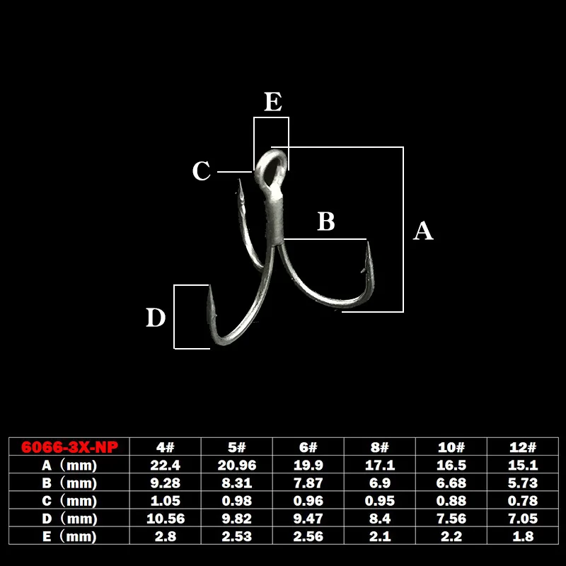 Descripción :OUTKIT 5 unids/caja 6066-3x-NP fortalecer gemelos súper fuertes aleación de acero señuelo afilado anzuelo triple 4# 5# 6# 8# 10# 12# Caja de pesca con gancho para aparejos de pesca