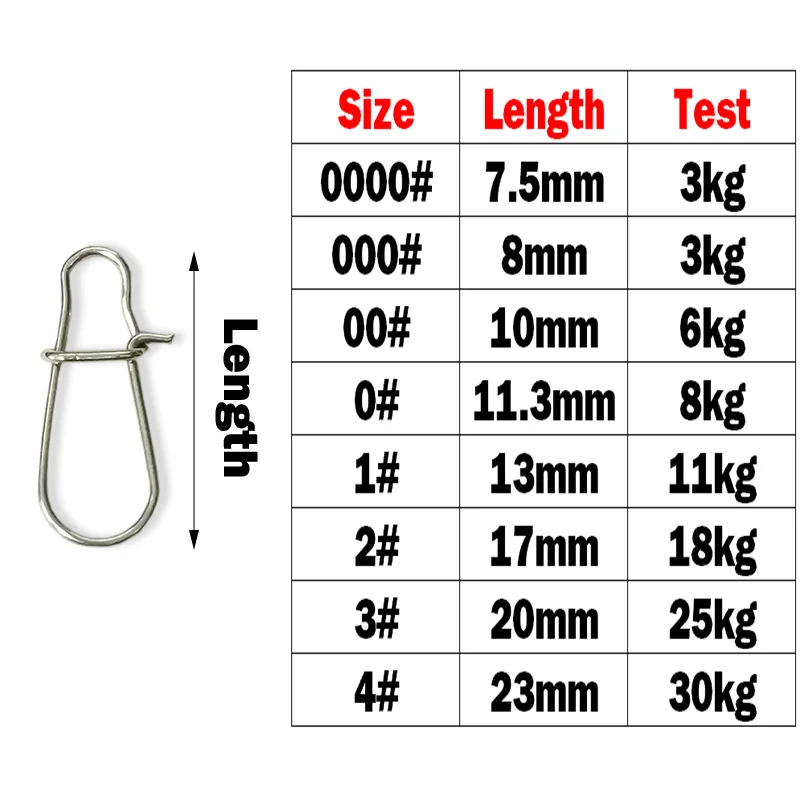 Descripción :50 Uds Pin giratorio de acero inoxidable accesorios de pesca conector Clip de señuelo giratorios aparejos de pesca en el mar
