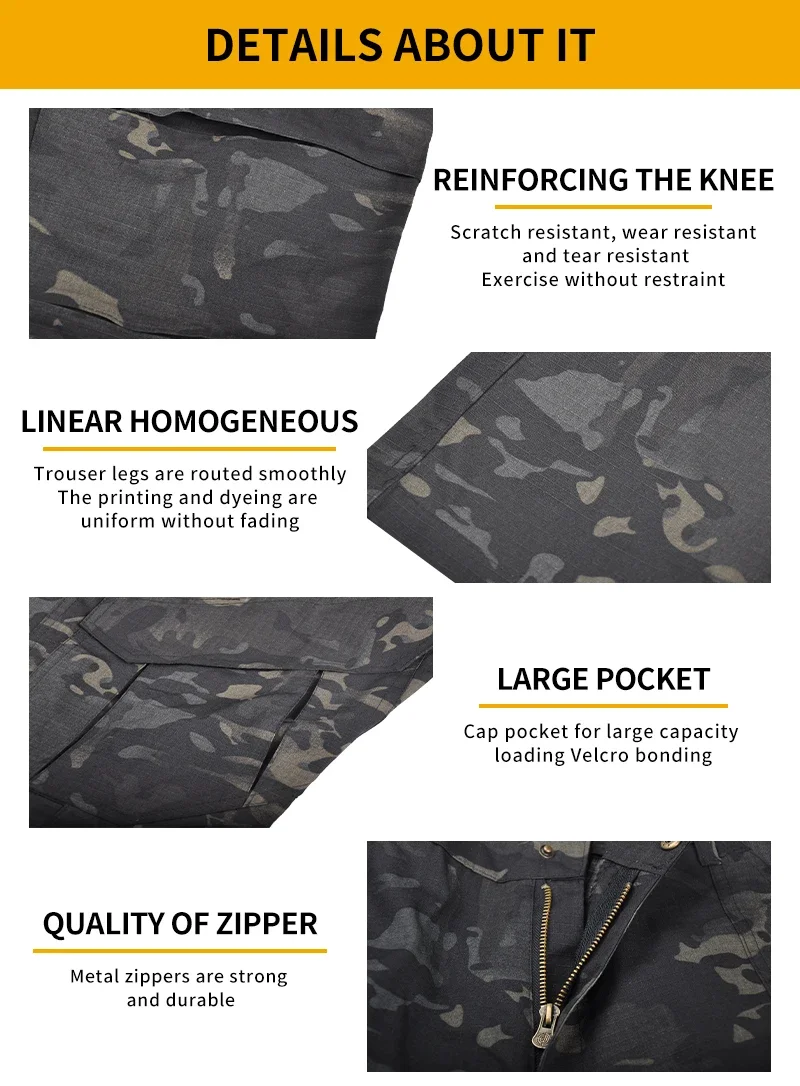 Característica: 1.Tela de rejilla especial, resistente al desgaste, resistente a los arañazos y al desgarro. 2.La tela es impermeable, lo que facilita el manejo de la lluvia ligera al aire libre. 3.Diseño elástico de la cintura trasera, cómodo y no apretado. 4.Diseño de refuerzo de rodilla, más duradero. 5.Múltiples bolsillos para mejorar la capacidad de carga.