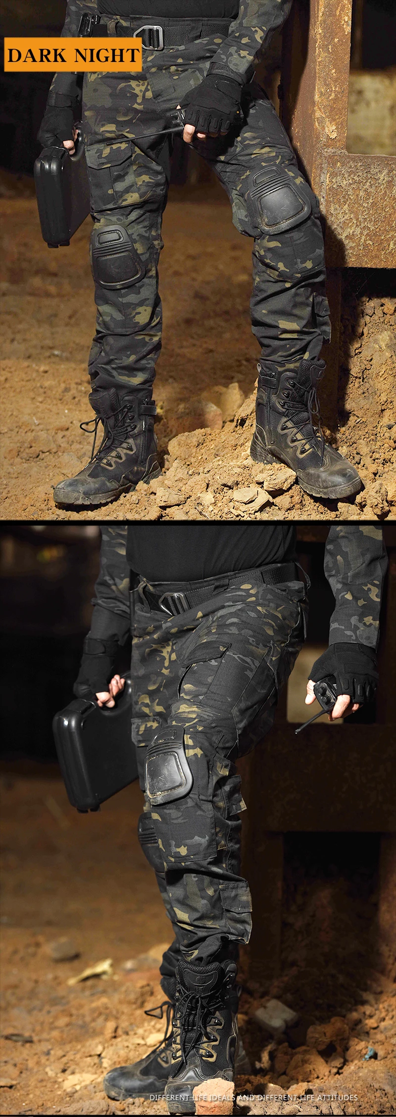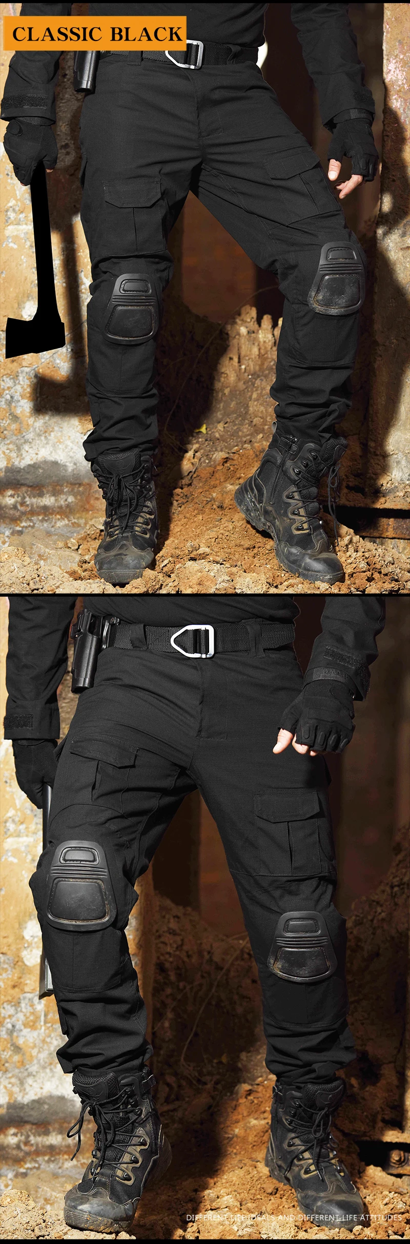 Material:65% poliéster + 35% algodón: tejido ripstop duradero, Característica: 1. En total, 10 bolsillos, 4 bolsillos de gran tamaño 2. Velcro ajustable en la parte inferior del pantalón y las rodillas 3. Material resistente a la abrasión, secado rápido y fácil de limpiar 4. Rodillera extra gruesa, más gruesa y usable.