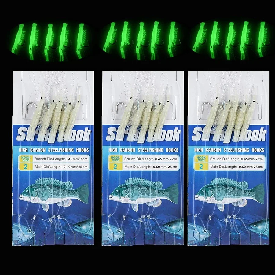 Paquete de 12 5 ganchos/paquete de anzuelo luminoso suave para cuerda de camarón, señuelo de pesca, aparejos de cebo Sabiki de agua dulce y salada, aparejos de aparejo Sabiki