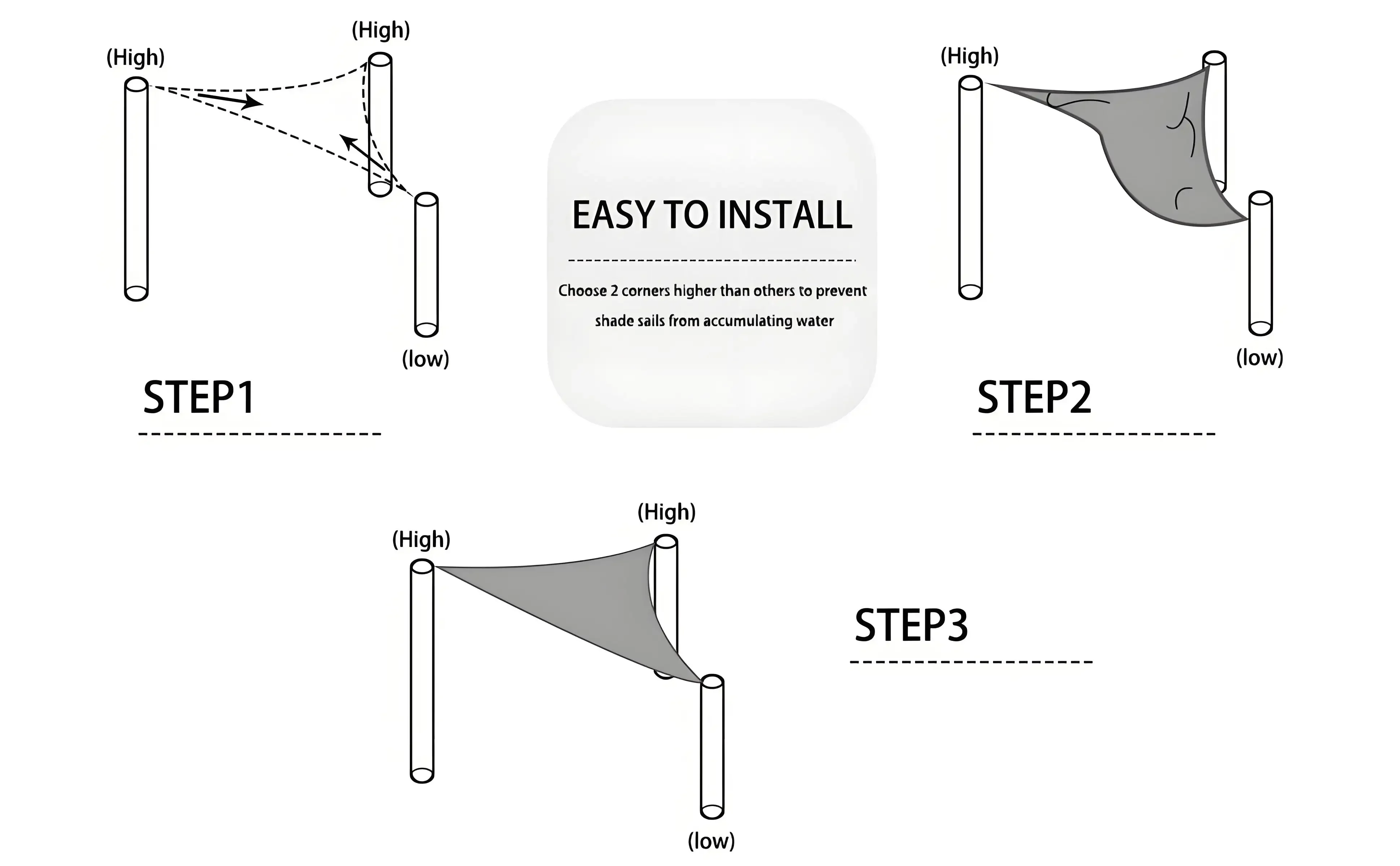 RESISTENTE AL AGUA:Nuestras velas de sombra son resistentes al agua con una clasificación de 400 mm HH, lo que significa que pueden resistir el agua hasta cierto punto pero no son completamente impermeables.También son permeables al aire, lo que garantiza la circulación de aire fresco para una experiencia cómoda al aire libre.La instalación es segura y fácil con la cuerda, y sugerimos un ángulo de 20-40 grados para una máxima tensión y escapamiento de lluvia.