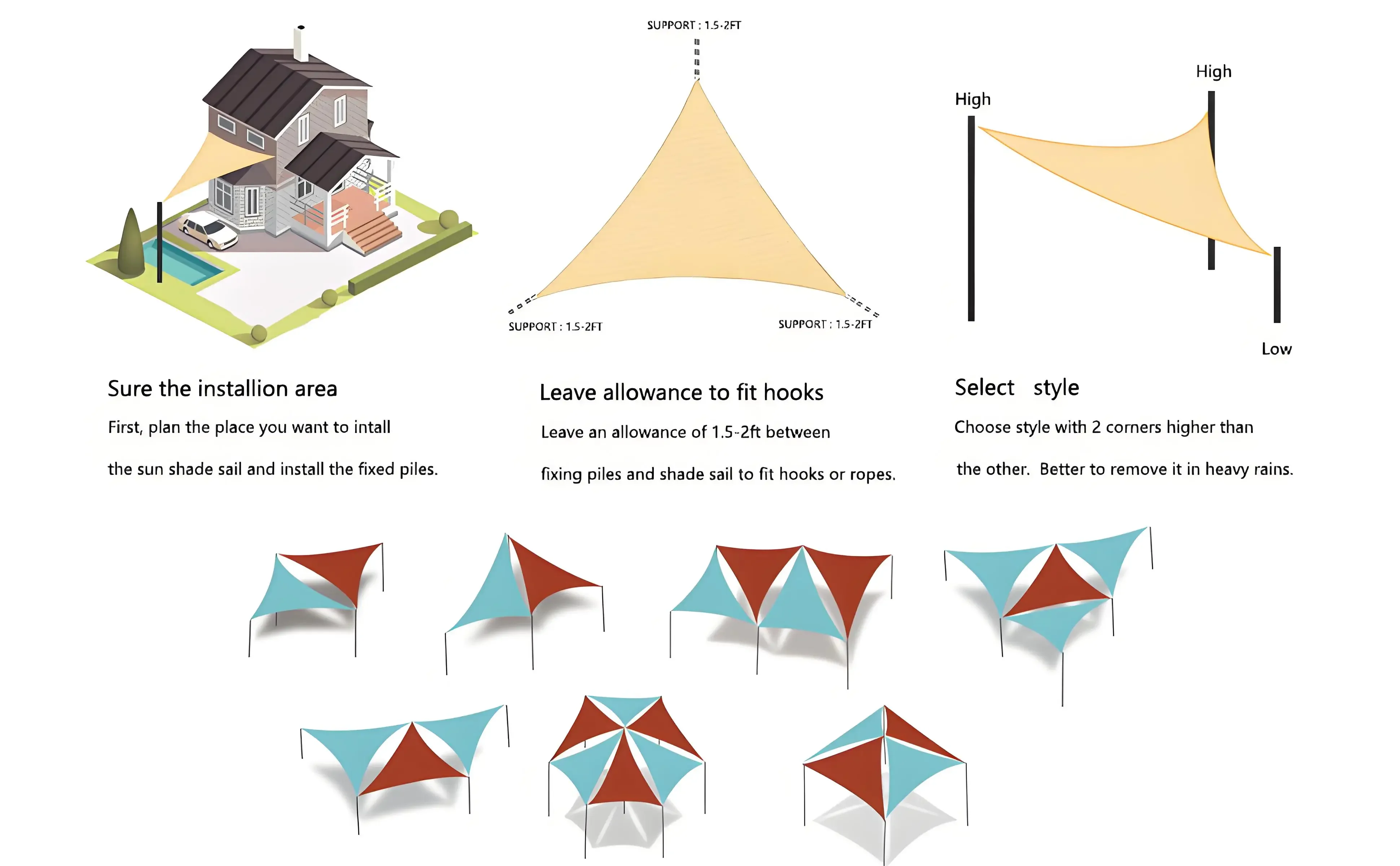 FÁCIL DE INSTALAR:Nuestras velas de sombra son fáciles de instalar.Simplemente mida y limpie el área de instalación, dejando 1,5-2 pies entre el punto de fijación y la vela de sombra para colocar herrajes, ganchos o cuerdas.Los lados curvos mejoran la fuerza de tracción y evitan que se caiga, lo que puede hacer que el área de sombreado real se encoja ligeramente (tolerancia de 4 a 6 pulgadas en cada lado).Puede instalar múltiples velas de sombra de diferentes colores y tamaños para un área de sombreado más grande.