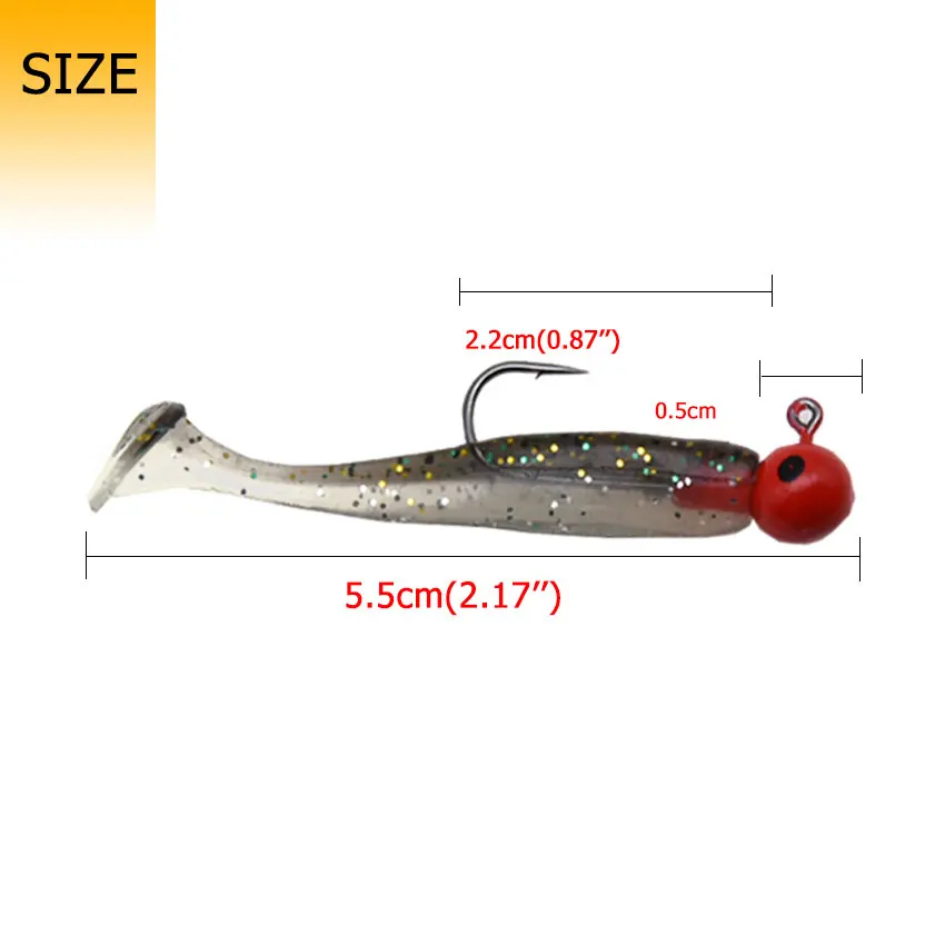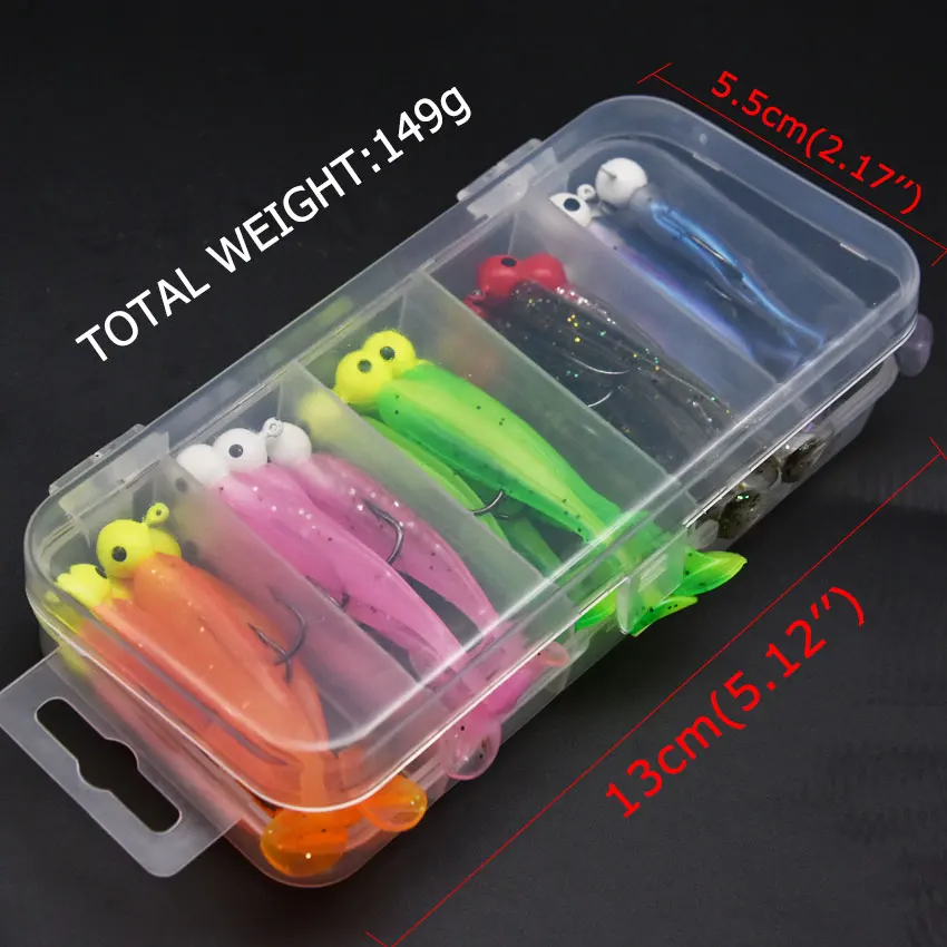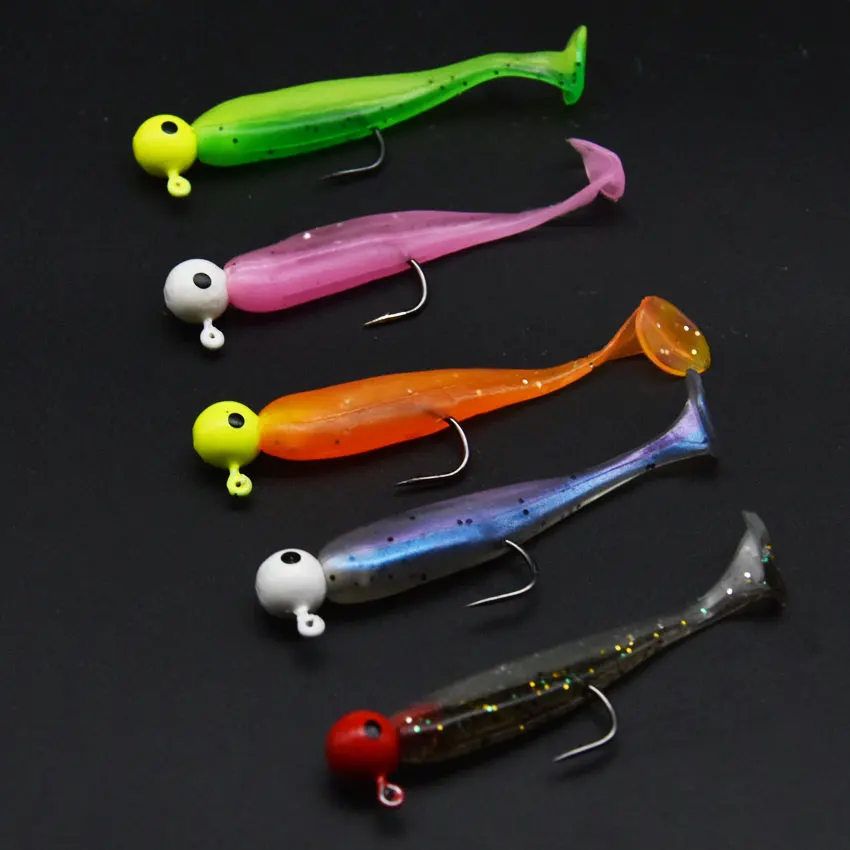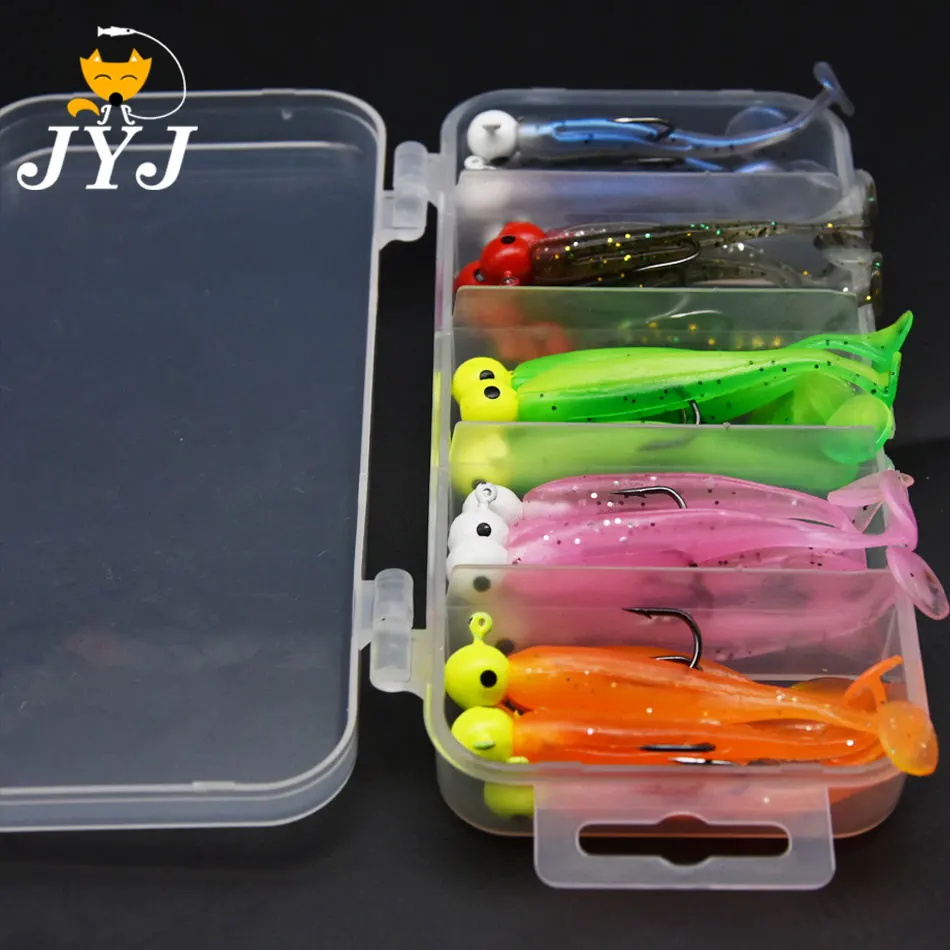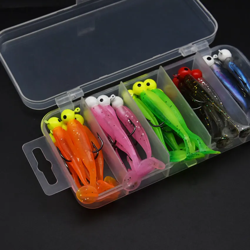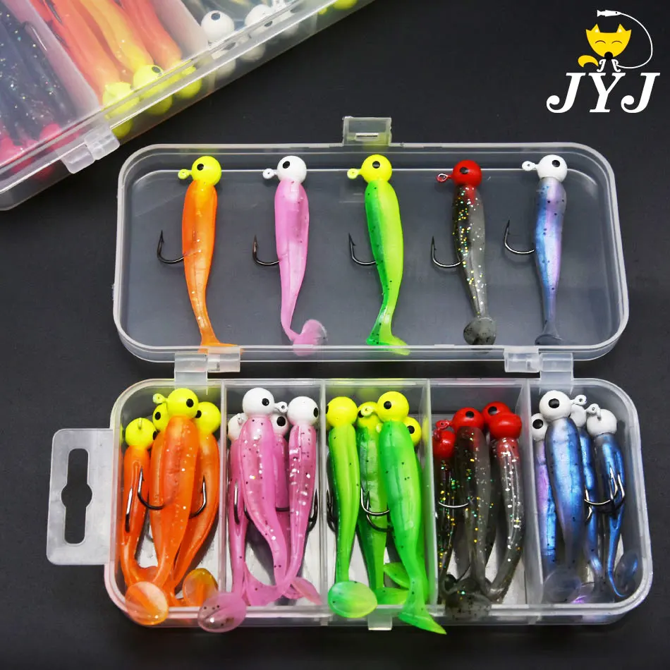 Paquete de caja JYJ, 25 uds., 5cm, paleta de sílice suave, cola en T, señuelo de gusano, cebo para pesca, señuelo de gusano artificial con anzuelo de plantilla