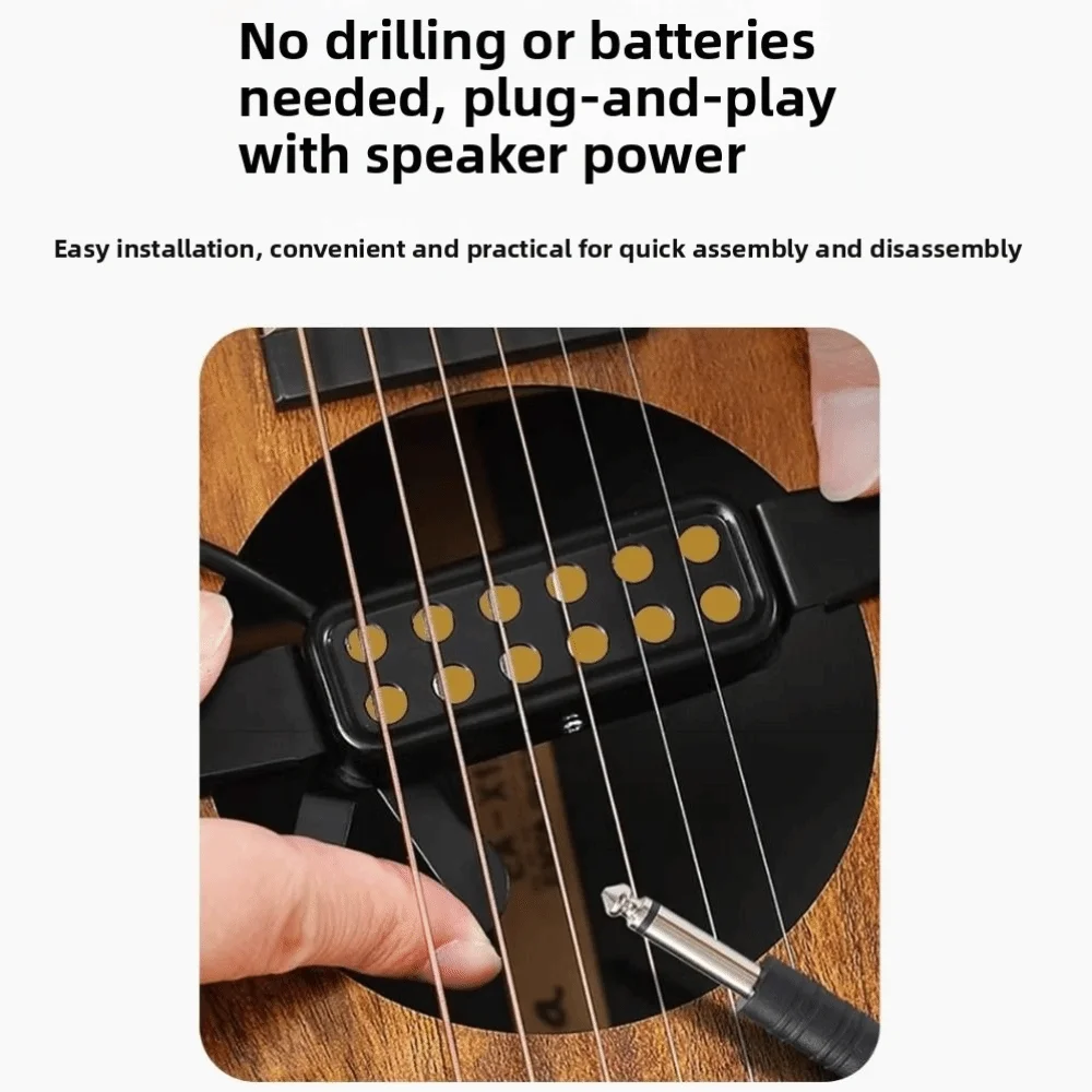 Fácil de instalar: se puede enganchar en la boca de la guitarra y conectar la entrada de audio con un conector estándar de 1/4".