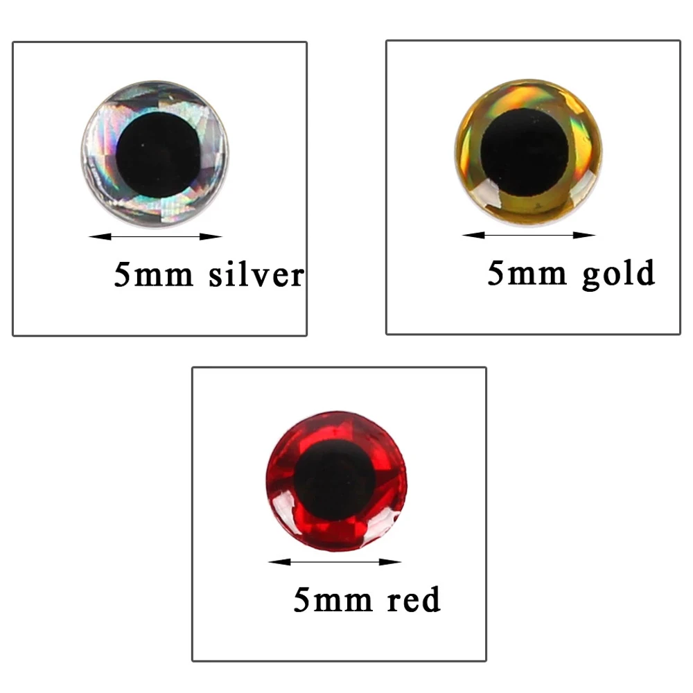 Item : Artificial Fish Eyes Material : PVC Color : Silver, Red, Gold Size : 3mm, 4mm, 5mm, 6mm Used For : Saltwater Fishing Lure Package : OPP Bag Quantity : 100pcs Package include:100pcs/lot Fishing Lure Eyes
