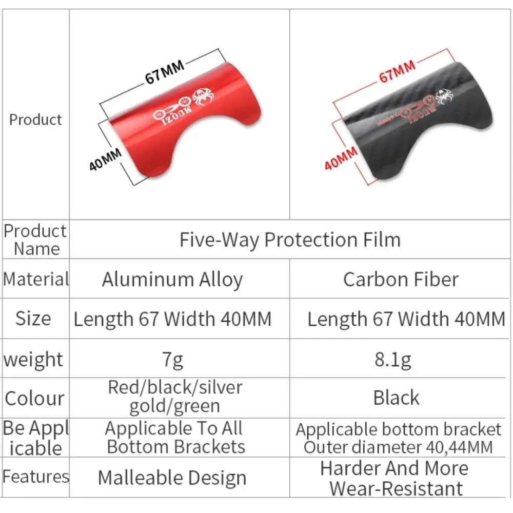 Nombre del producto: pegatina de protección del soporte inferior Material: aleación de aluminio/estilo de fibra de carbono: 7 opciones Color: rojo/Negro/plata/oro/Verde Tamaño: como se muestra Lista de productos: pegatina de protección del soporte inferior de 2, 4 adhesivos para la parte inferior. Características: El diseño de plasticidad de la aleación de aluminio se adapta mejor al soporte inferior y tiene una adaptabilidad más amplia. El material de fibra de carbono es más de gama alta, pero debe medir las especificaciones del soporte inferior antes de realizar el pedido.