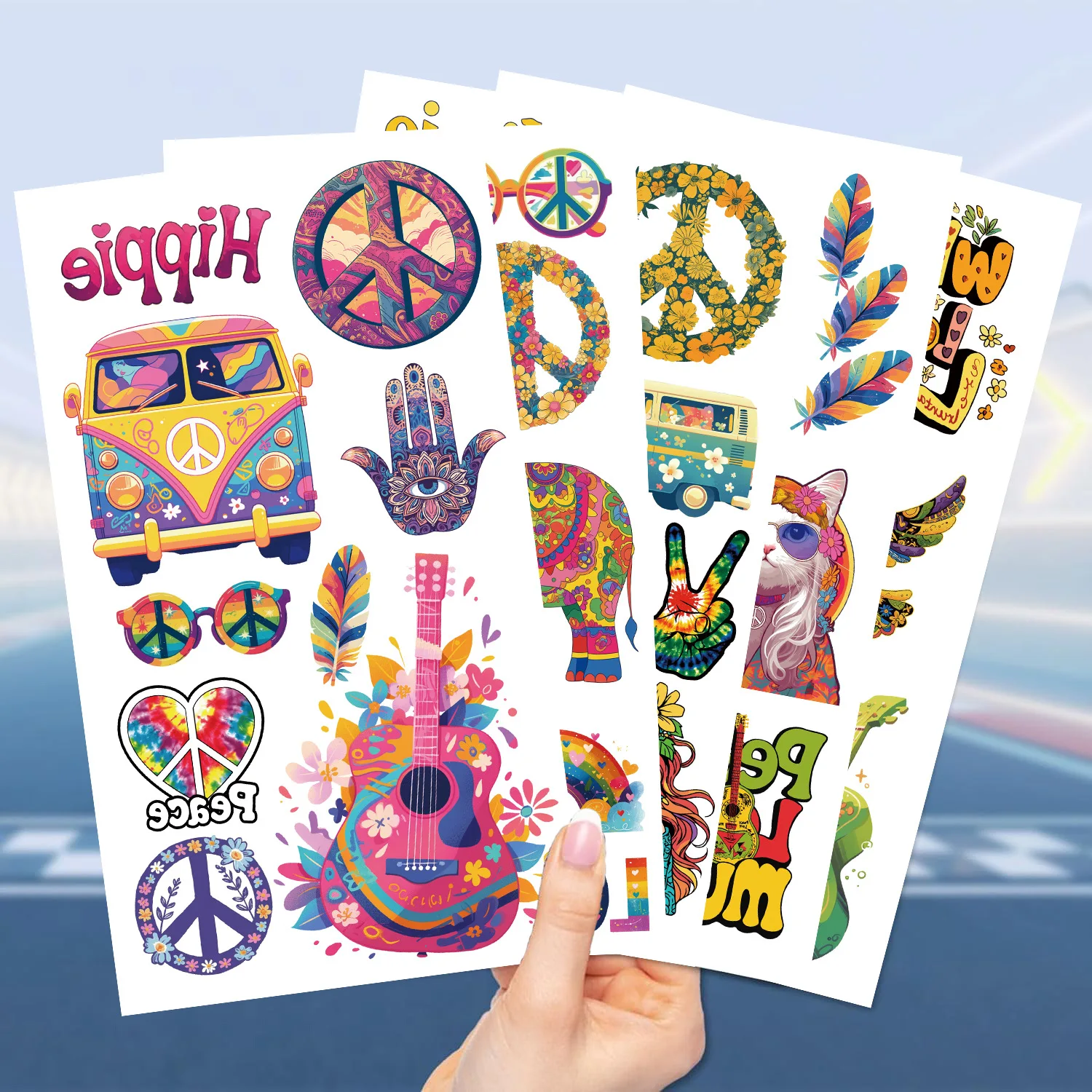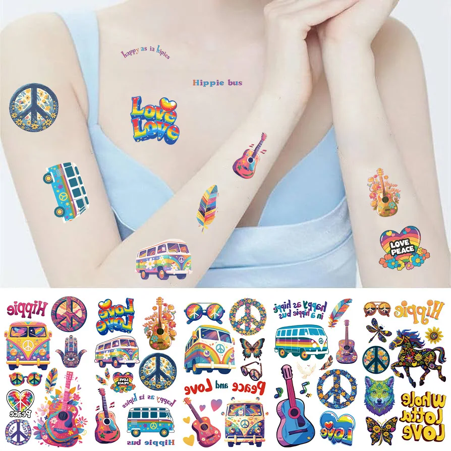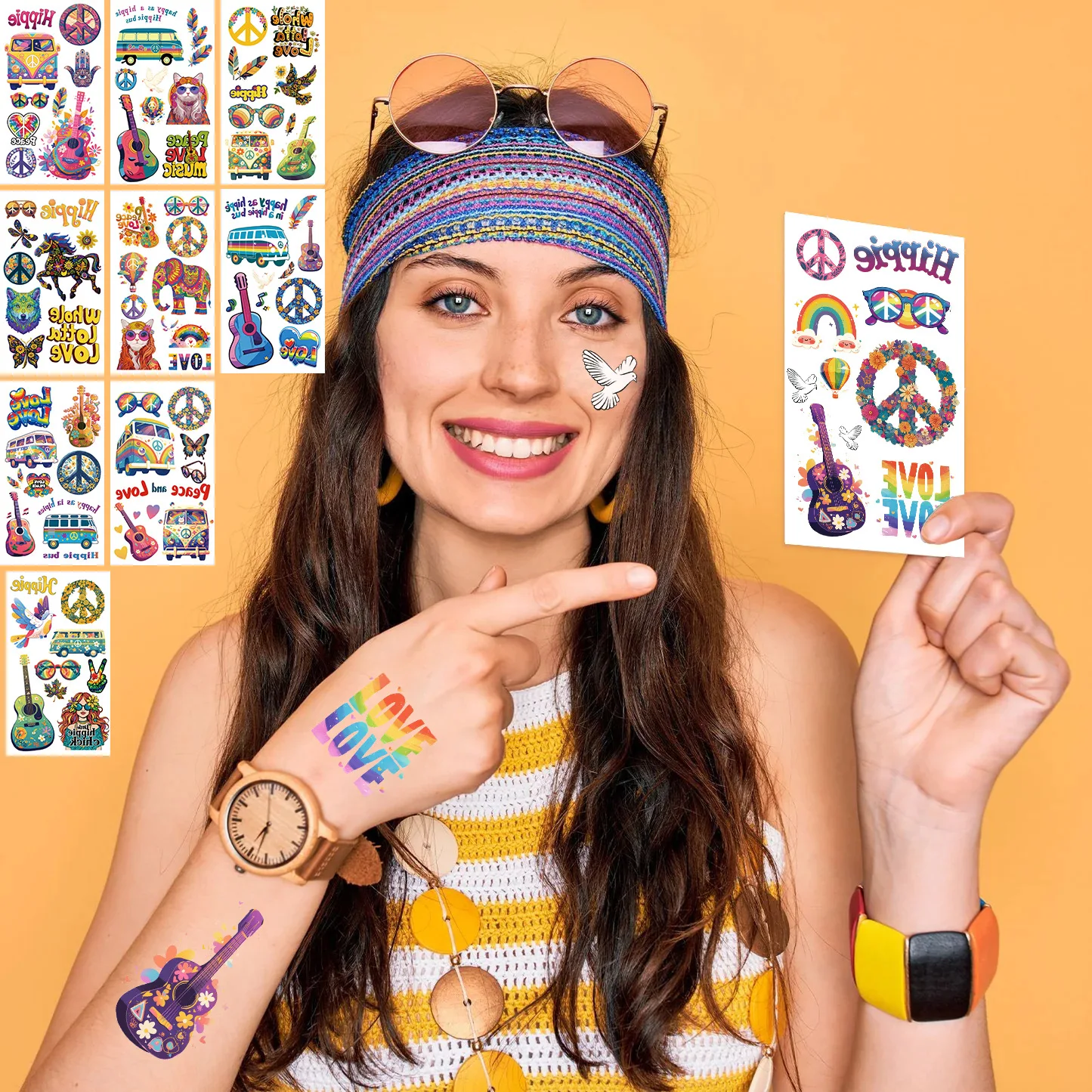 Pegatinas de tatuaje Hippie para niños, tatuajes falsos temporales, brazos, manos, cuerpo, juguetes de regalo, 10 hojas