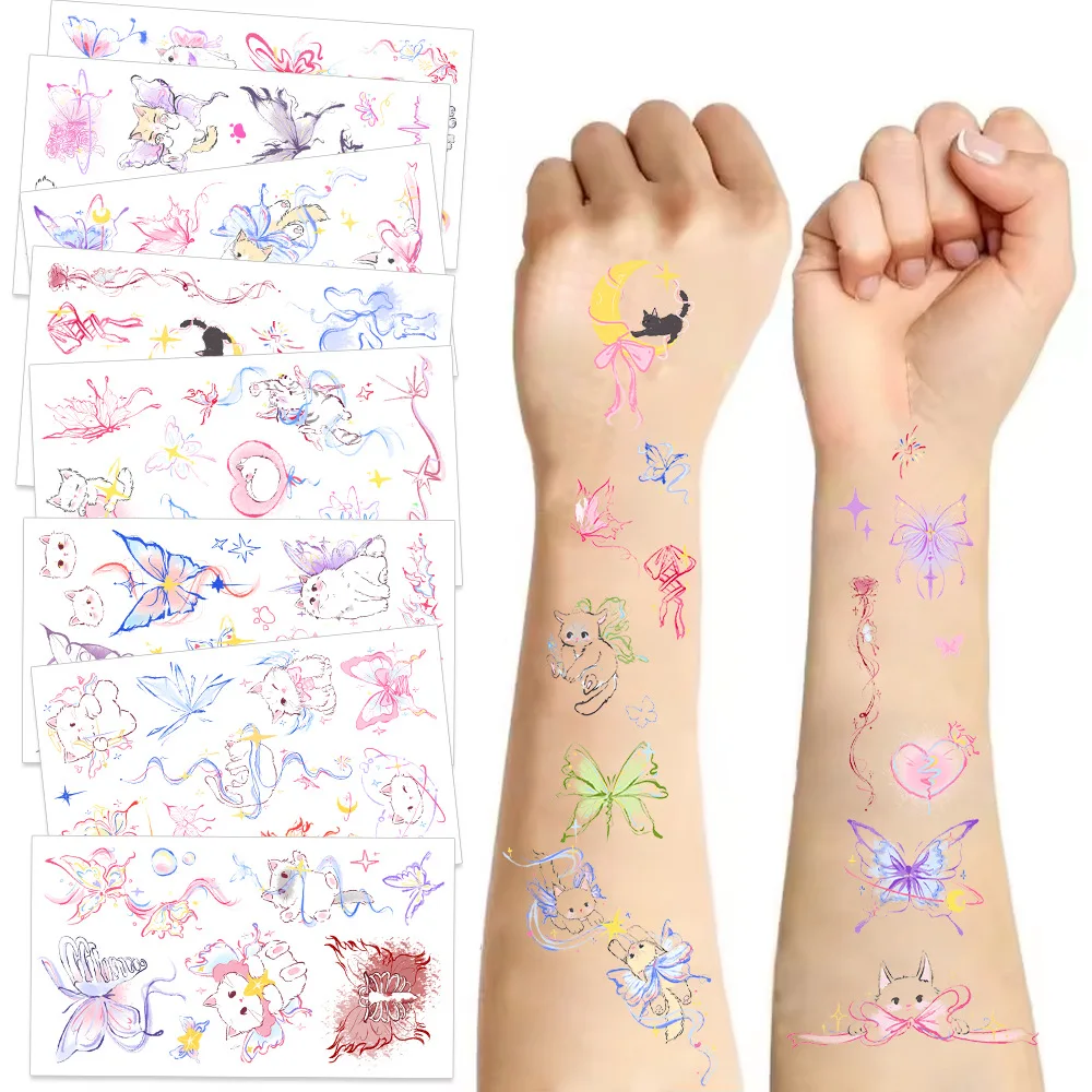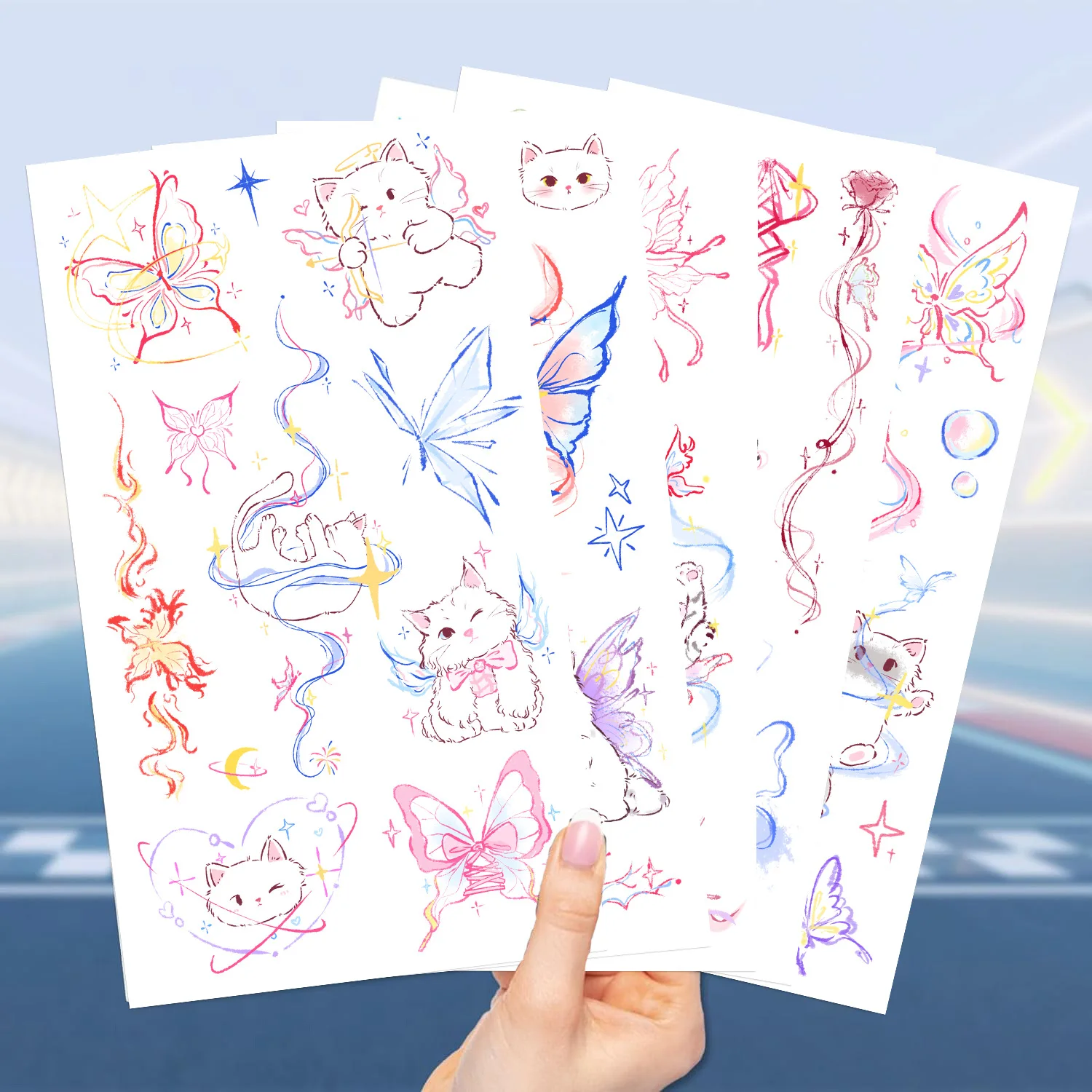 Pegatinas de tatuaje de mariposas y gatos, 10 hojas, el secreto de las mariposas y los gatos, tatuaje falso temporal, brazo, manos, cuerpo, tatuaje de agua para regalo