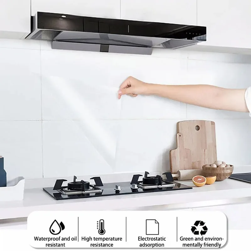 • Protección electrostática: La película protectora electrostática transparente ofrece una protección superior contra salpicaduras de aceite, asegurando que su pared se mantenga limpia y ordenada.