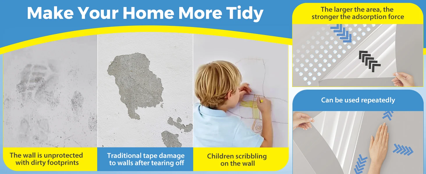 ⚡PELÍCULA ESTÁTICA DE PROTECCIÓN DE PARED: la película protectora de pared utiliza tecnología de adsorción estática, que es fácil de usar, se absorbe rápidamente, absorbe transparente y hermosa y combina con la decoración.Se adhiere firmemente a superficies lisas sin necesidad de adhesivos.