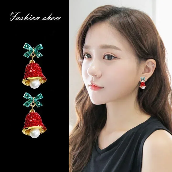Pendientes de árbol de Navidad de circón colorido para mujer, lazo, perla, carillón de viento, campana, pendiente para niñas, regalos de joyería de vacaciones de Año Nuevo