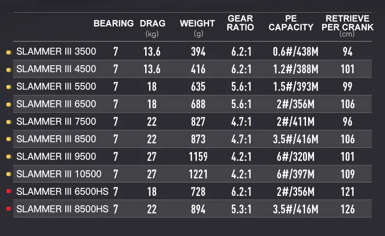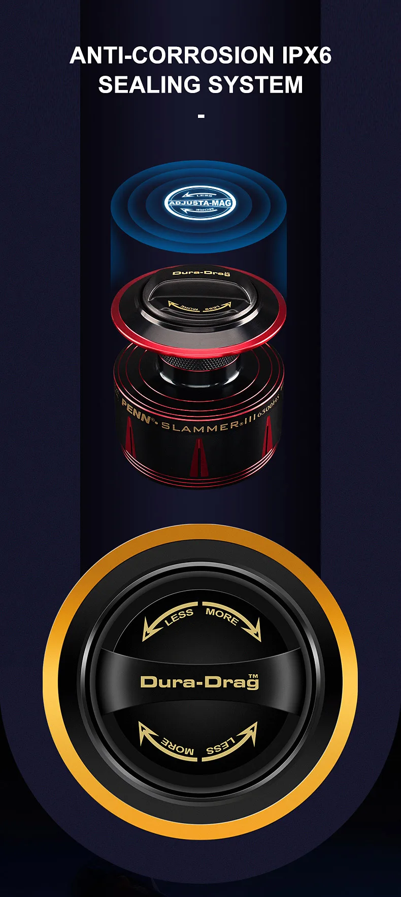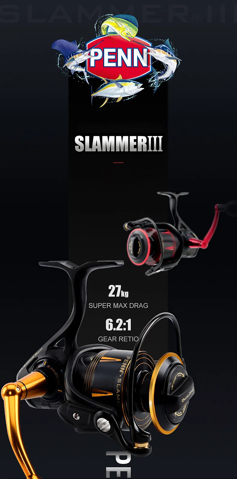 El PENN Slammer III está de vuelta por demanda popular. Construido para la pesca pesada, ya sea desde barco o tierra, y la confianza de los capitanes charter de todo el mundo. Los carretes Slammer III cuentan con nuestro nuevo sistema sellado IPX6 que mantiene el agua fuera de la caja de cambios y el sistema de arrastre. También estamos utilizando nuestro sistema Slammer Drag actualizado que ahora utiliza nuestro material Dura-Drag patentado.