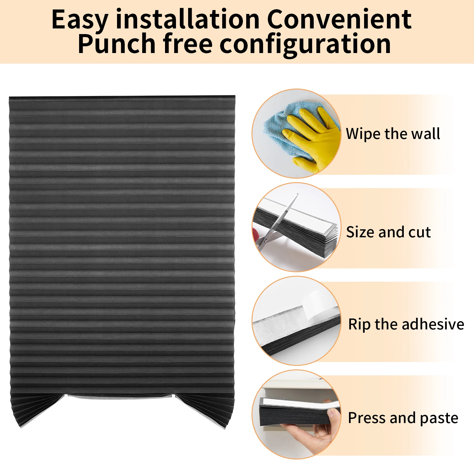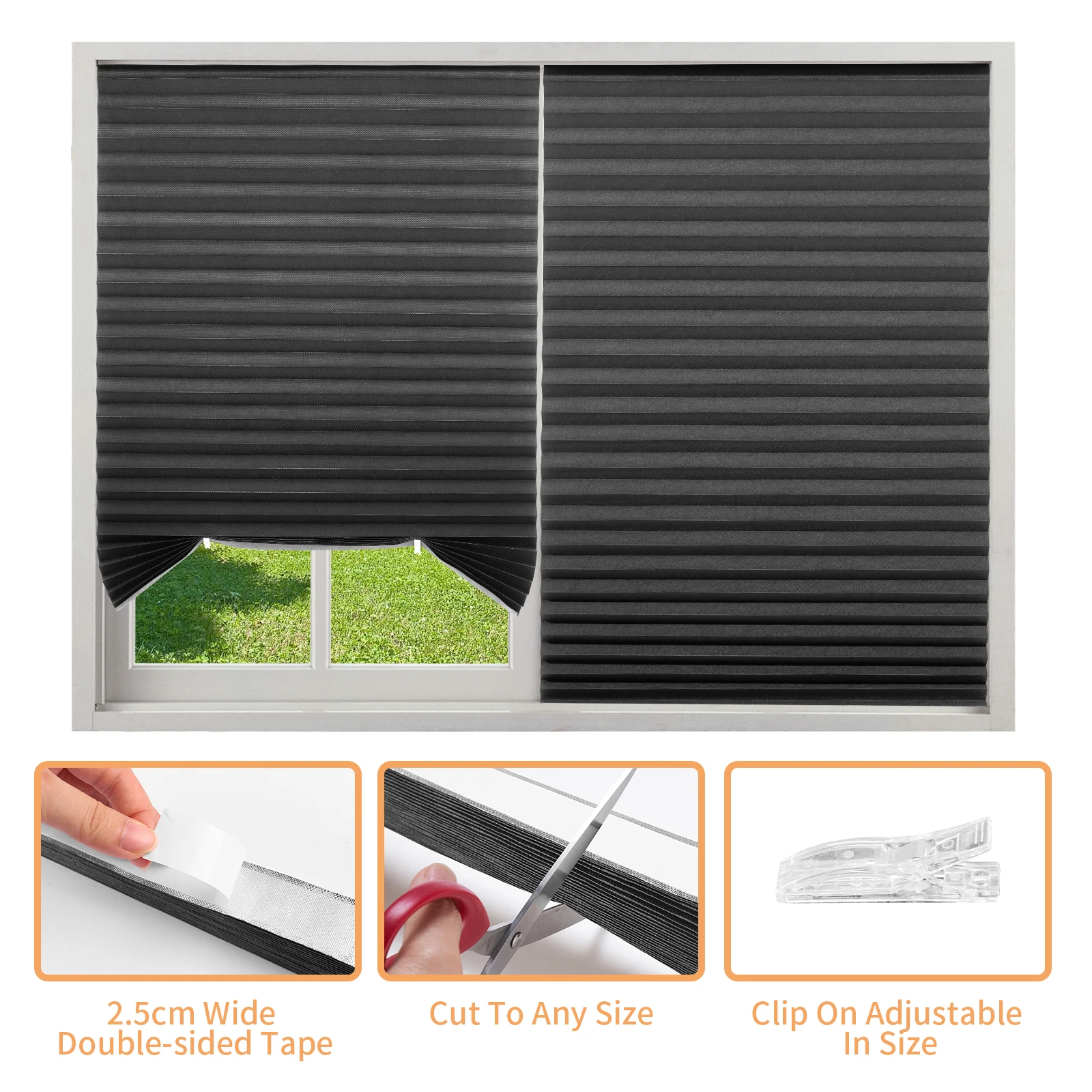 【Fácil de instalar】 Las persianas adhesivas se instalan en solo tres pasos: cortar, rasgar y pegar.Las persianas vienen con cinta de doble cara de fuerte viscosidad de 2,5 cm de ancho.Sin taladrar, sin caerse, sin agujeros y sin dañar la pared y la ventana.Fácil de quitar y no deja manchas. 【Material premium】Nuestras persianas de papel están hechas de tela no tejida espesa de alta calidad, impermeable y a prueba de polvo, no tóxica y transpirable.Los colores blanco, azul y marrón son para filtrar la luz, los colores negro y gris son opacos y resistentes a los rayos UV. 【Cortado a medida】 Persianas de ajuste perfecto para ventanas y puertas, fáciles de cortar en cualquier tamaño y forma, para adaptarse a sus ventanas. Adecuado para ventanas o puertas de varios tamaños en dormitorio, cocina, baño.Embalaje de cartón para evitar arrugas y distorsiones durante el transporte. 【Clip ajustable】Cada persiana temporal viene con dos clips, para que puedas ajustar fácilmente la altura de la sombra.El diseño inalámbrico, adecuado para familias con niños y mascotas, garantiza la seguridad de su familia.