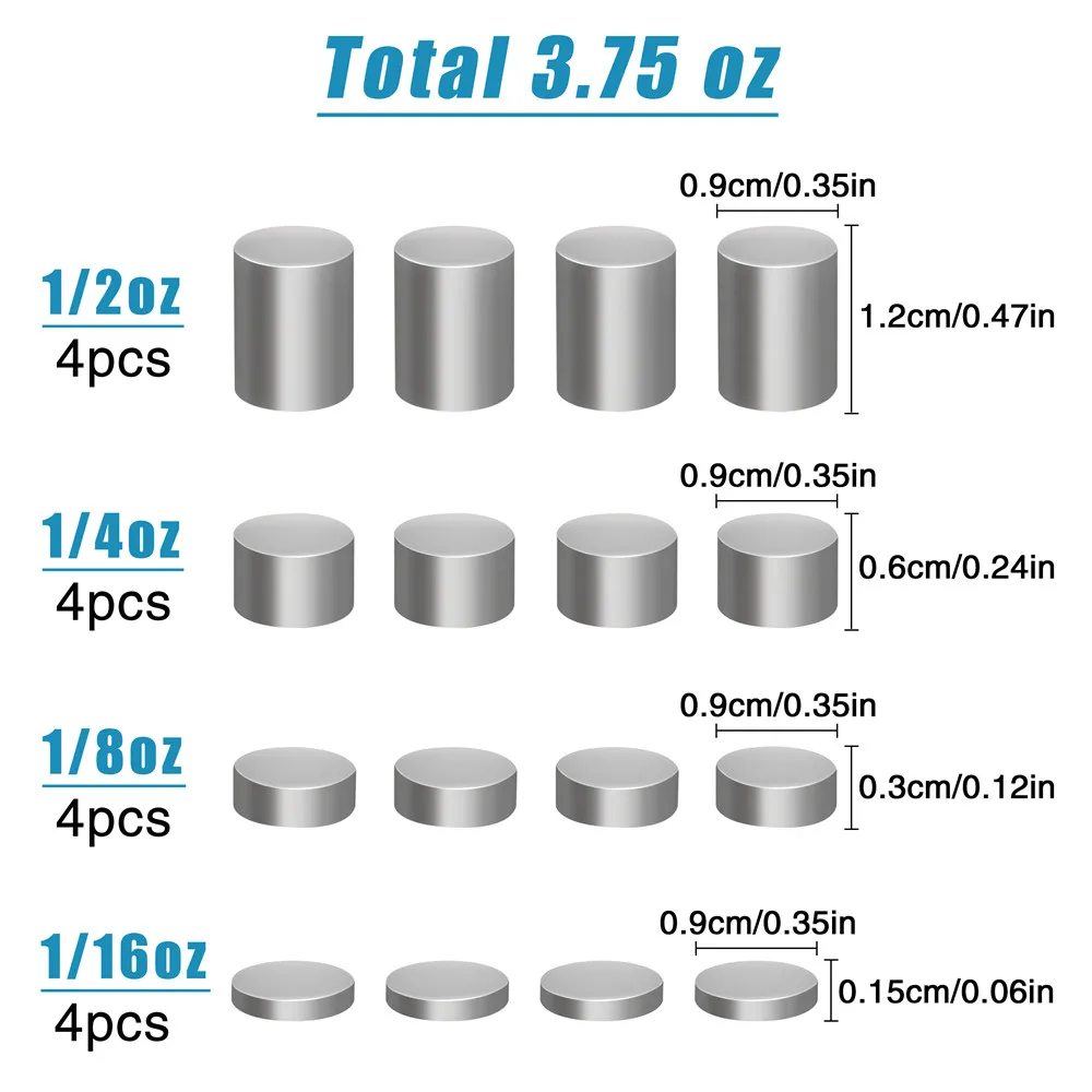Pesos cilíndricos de tungsteno de 3,75 onzas, 16 unidades, para coches de madera de pino, 4 tamaños diferentes, Kit de peso amortiguador de tungsteno