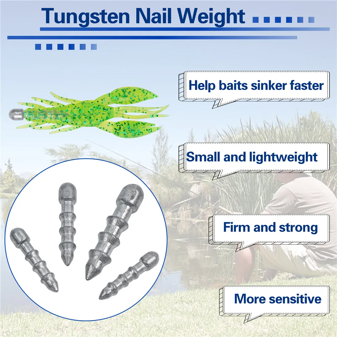 1. Las pesas de clavos se insertan fácilmente en cualquier cebo de plástico, se puede utilizar para herramientas de aparejo de pesca extravagantes, peso de gusano de pesca de trucha lubina.