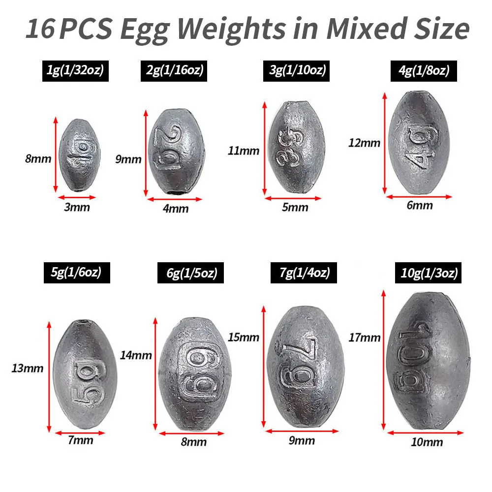 Pesas de pesca, plomadas de huevo, plomada de peso ovalada, agua salada, agua dulce, Texas y Carolina, aparejos de pesca de lubina, accesorios, tamaño mixto, 1g, 2G, 3G, 4G, 5G, 6G, 7g, 10g, 16 piezas