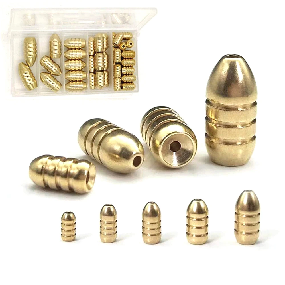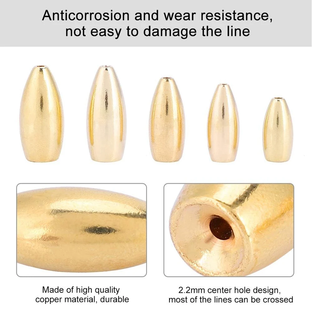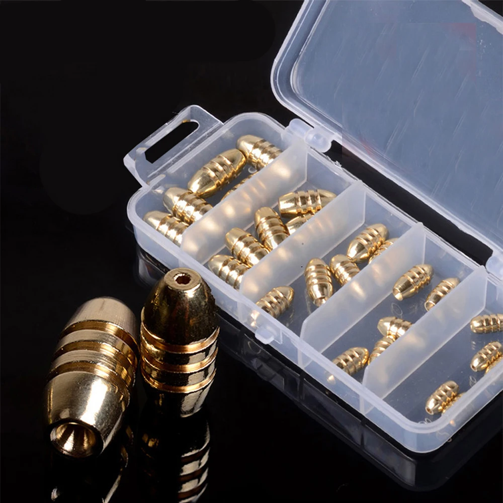 Pesas de pesas de cobre para pesca al aire libre, superficie lisa duradera, reduce la resistencia, 5 tamaños para aparejos de pesca de aguas profundas, 21 unids/lote por caja