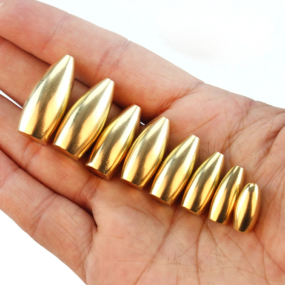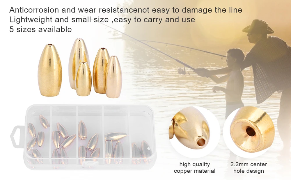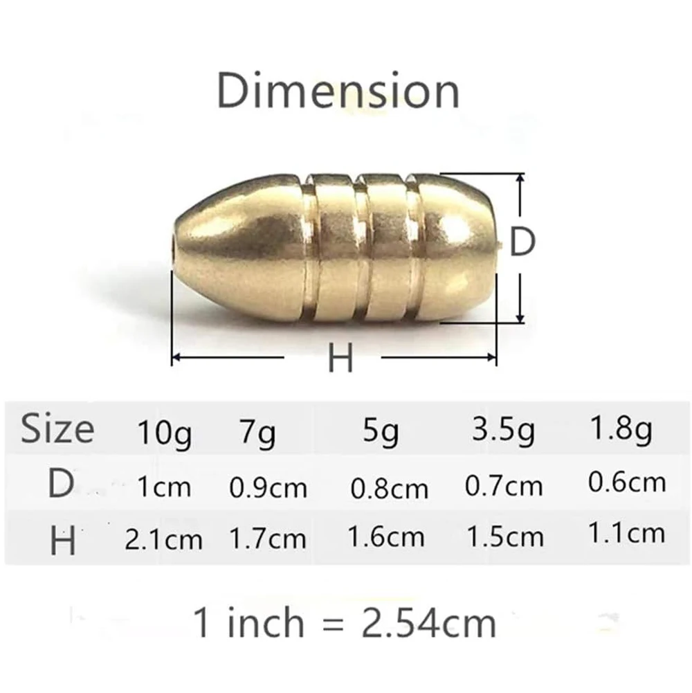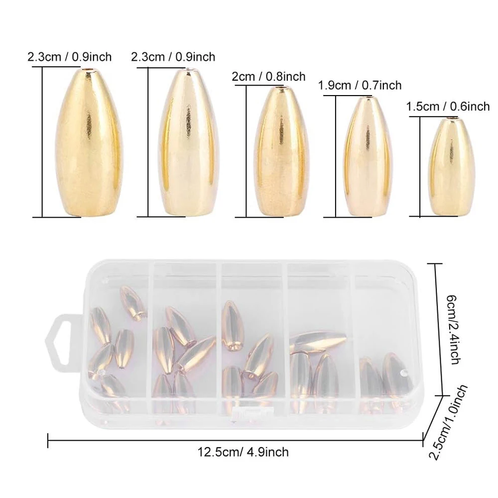 Pesas de pesas de cobre para pesca al aire libre, superficie lisa duradera, reduce la resistencia, 5 tamaños para aparejos de pesca de aguas profundas, 21 unids/lote por caja