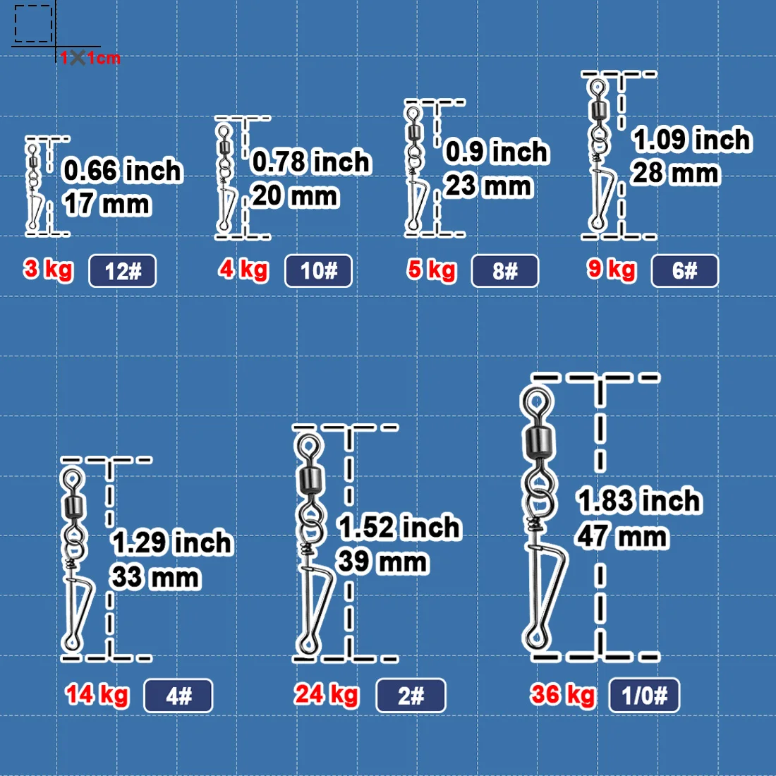 Adecuado para uso de pesca múltiple: los giratorios de pesca son aplicables para varios tipos de pesca, como pesca en agua salada, pesca en agua dulce, pesca en tierra y pesca en alta mar. Ofrecemos varios tamaños para su elección. Y la resistencia de estos giratorios a presión es diferente de 3 kg a 36 kg. Estos tamaños satisfarán sus necesidades para diferentes usos. Confirme los tamaños adecuados antes de comprarlos. Le brinda la mejor experiencia.