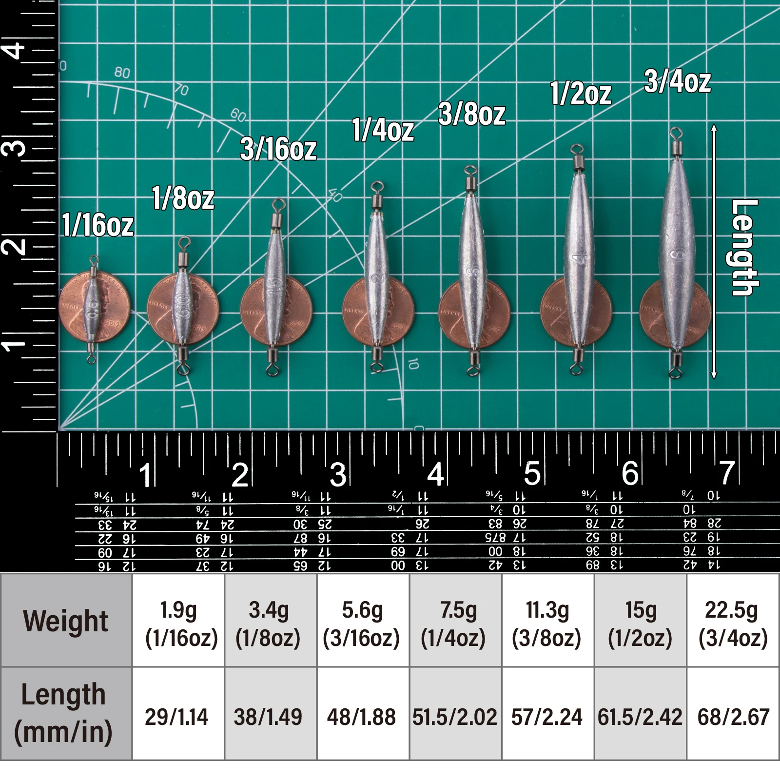 Versatilidad de varios tamaños: disponibles de 1/16 oz a 3/4 oz (7 tamaños), estas plomos se adaptan sin esfuerzo a cualquier estilo de pesca, adecuadas tanto para la pesca en agua dulce como en agua salada ligera/insorada.