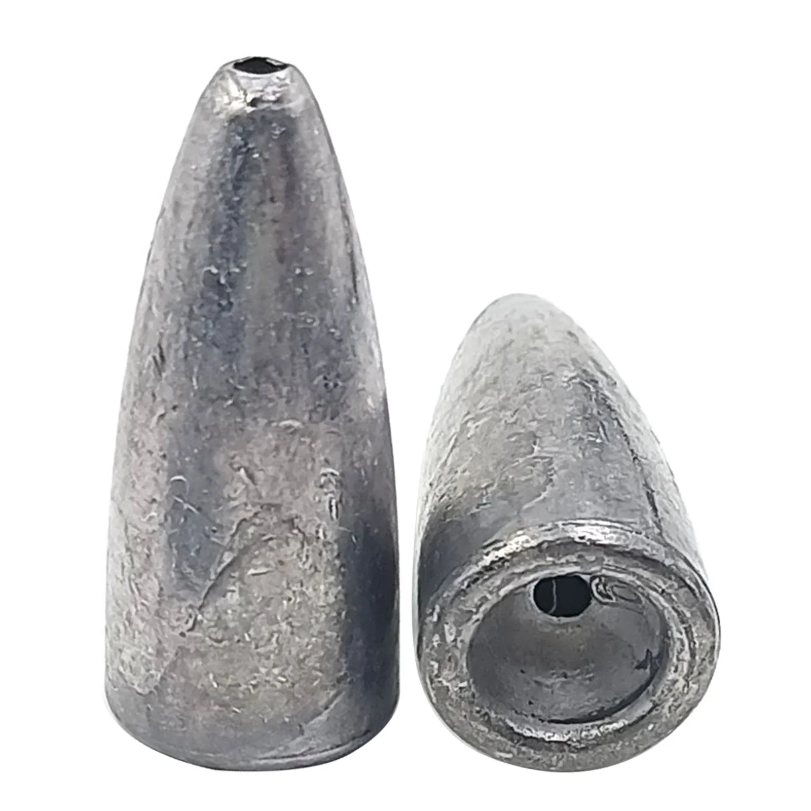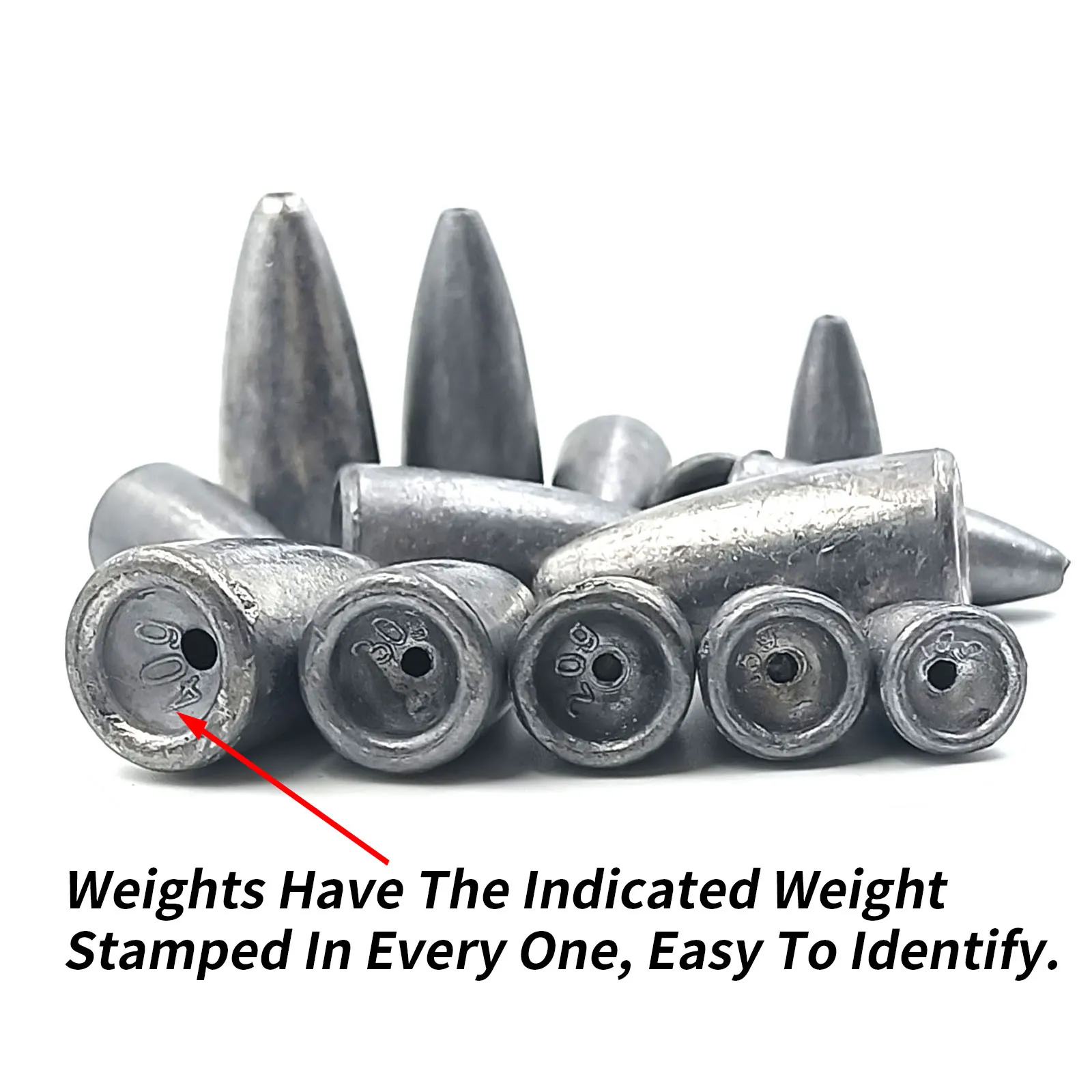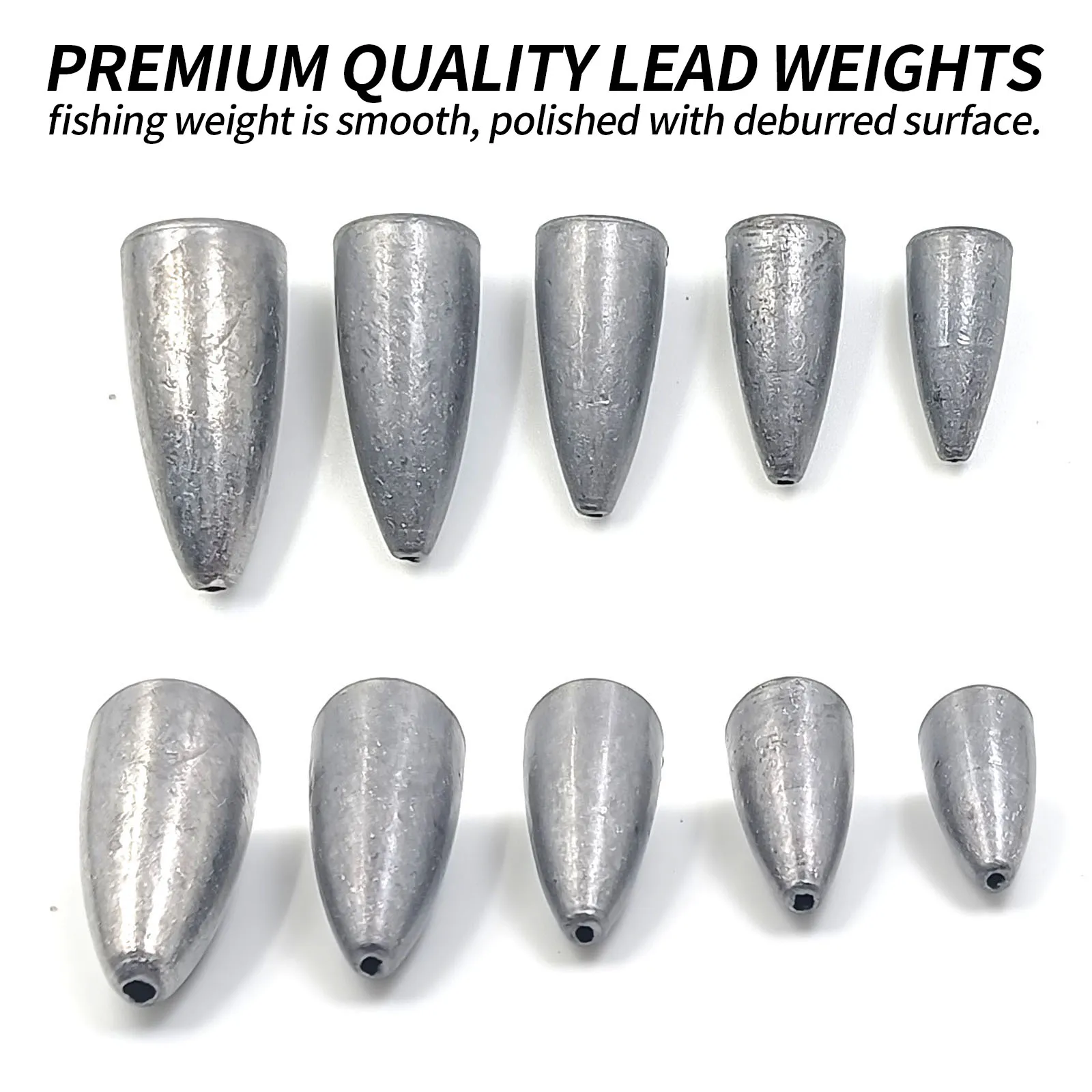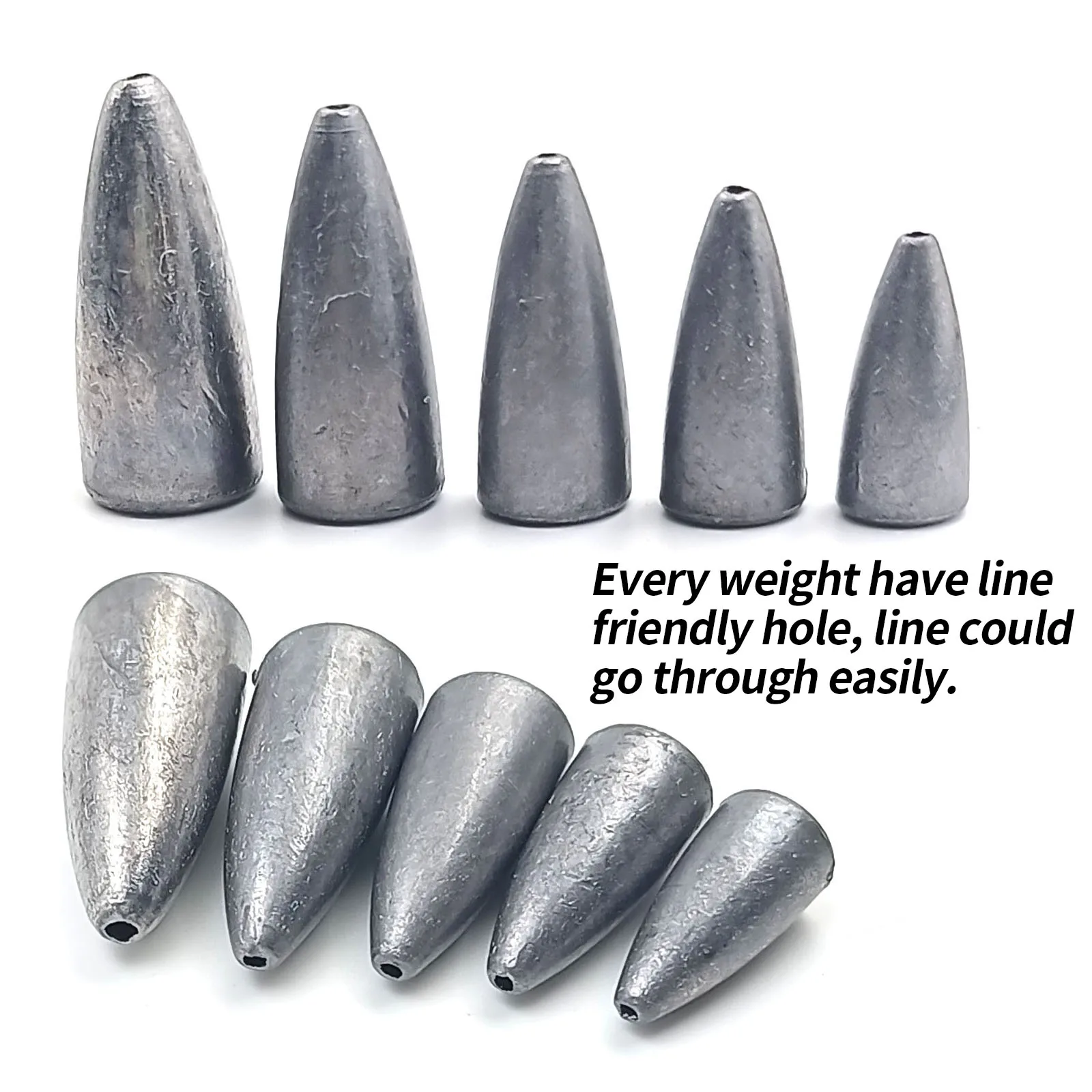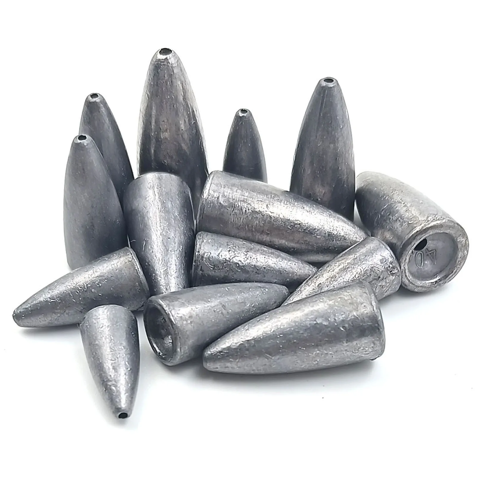 Plomos en forma de bala: Los plomos de cuerpo en forma de bala se pueden usar para pescar alrededor de las rocas, no se cuelgan tanto como las gotas de lágrima o los pesos de tiro redondo. Los pesos son perfectos en forma y tamaño para su uso en agua dulce y agua salada. No es fácil de enganchar en el fondo del lago o río. Si está pescando en lugares donde es propenso a perder plataformas debido a enganches, estas plomos son el camino a seguir.