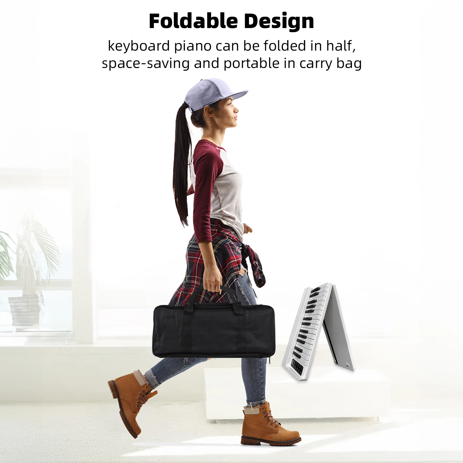 Diseño plegable: el piano con teclado se puede plegar por la mitad, ahorra espacio y es portátil en una bolsa de transporte; La batería recargable incorporada lo hace conveniente para uso en exteriores.